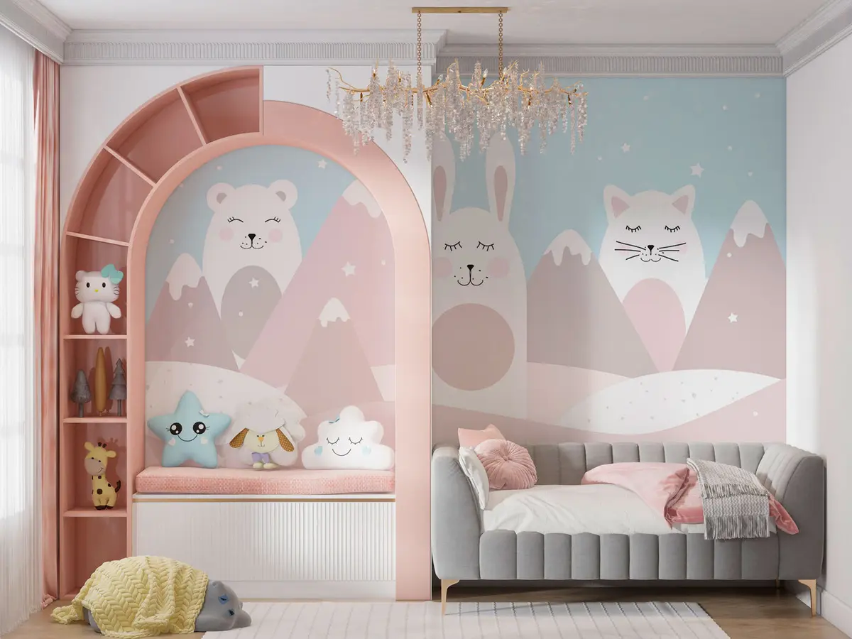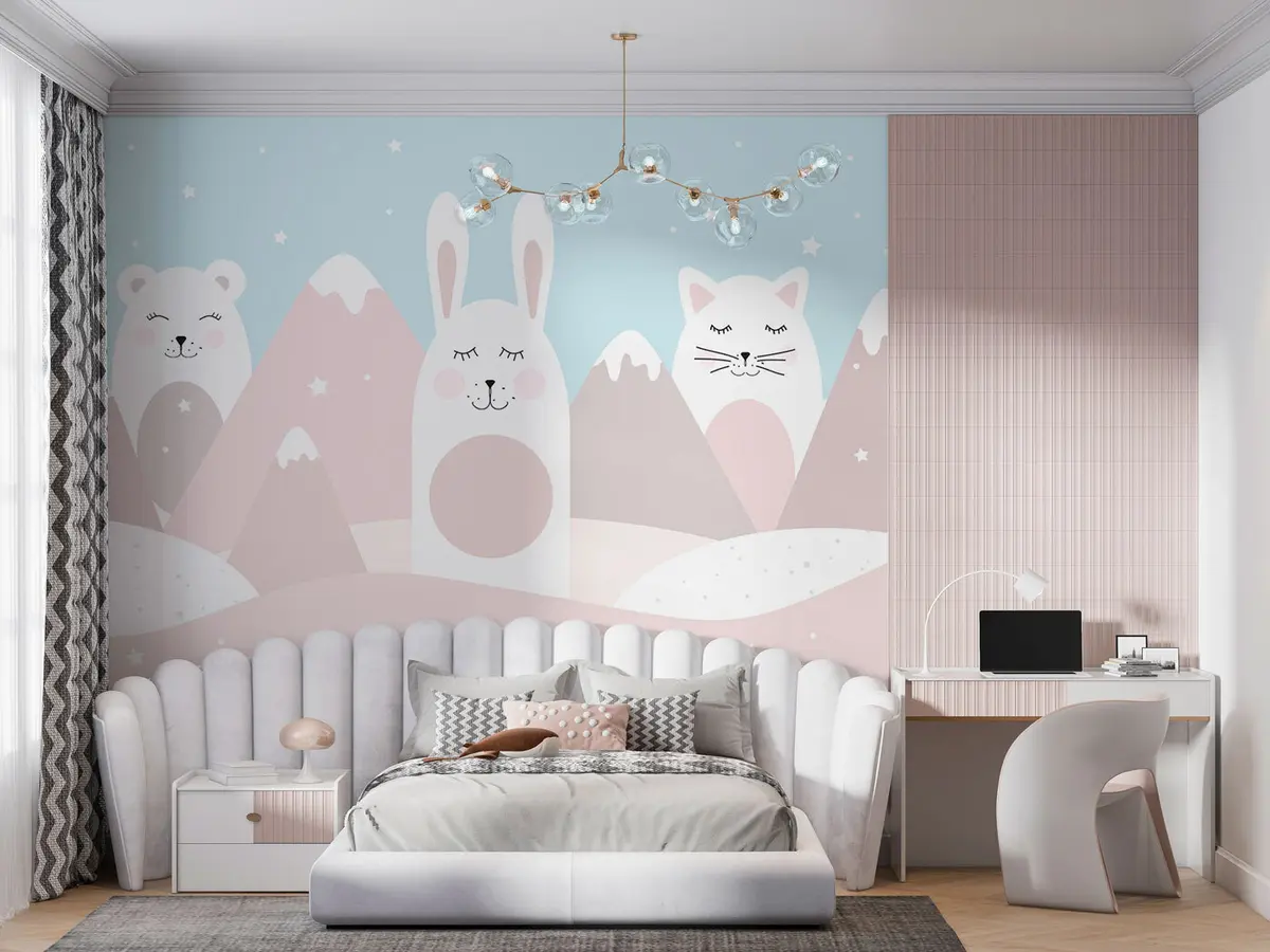 Фототапет Заек, мечка, лисица на фона на бежови планини, покрити със сняг Nr u98135