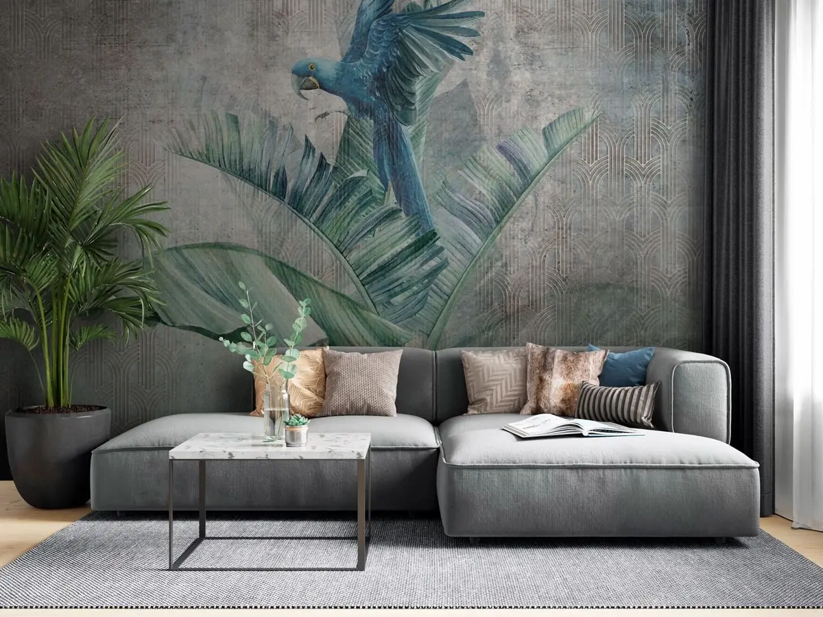 Фототапет Голям син папагал върху бананово дърво с гръндж бетонна текстура Nr u95432