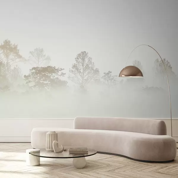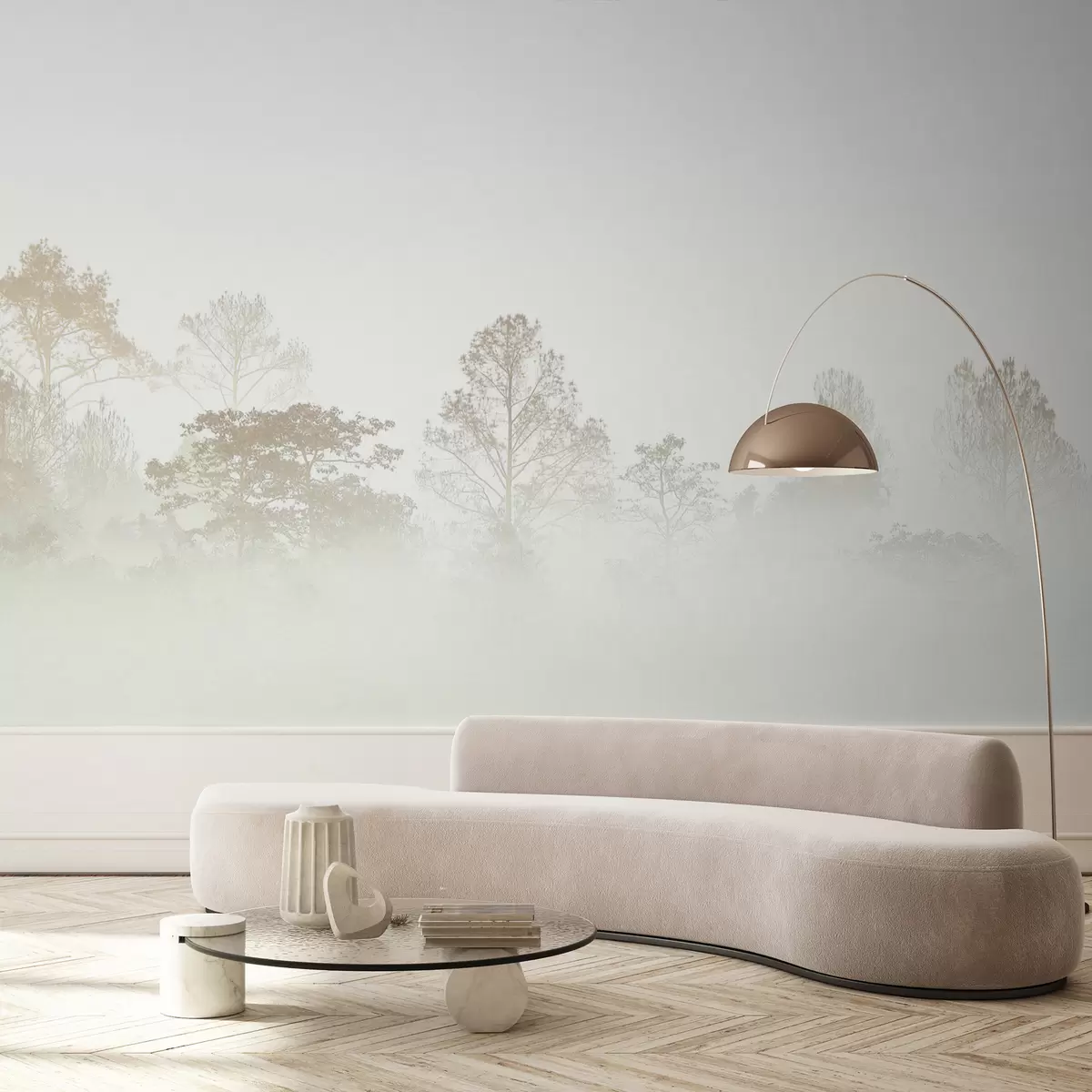 Фототапет Силует на горичка от дървета в гъстата бяла утринна мъгла Nr u97405