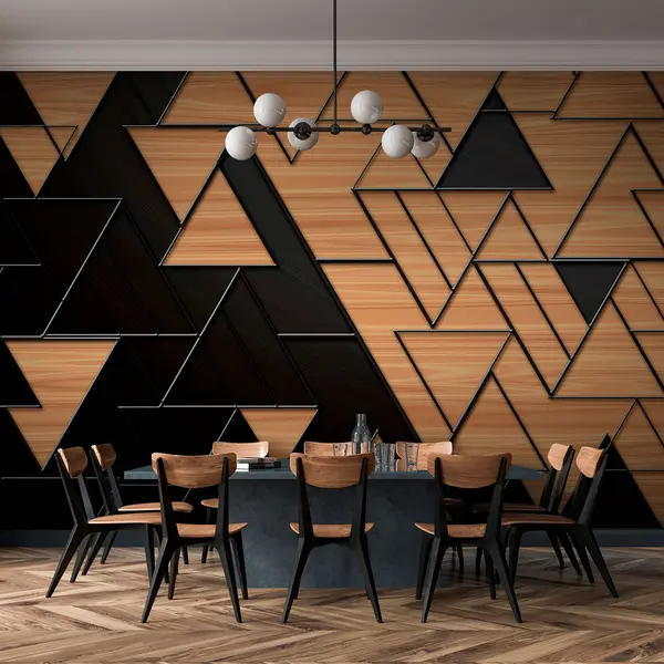 Фототапет 3D триъгълници в тъмно сиво и дървесна текстура с релефни линии Nr u75167