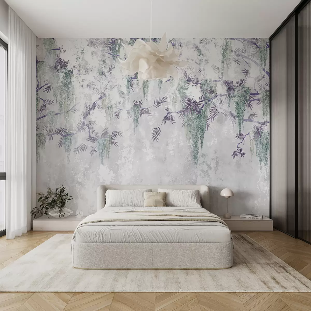 Фототапет Висящи модерни гръндж клони с лилави цветя в сини цветове Nr u73816v1