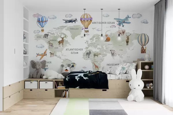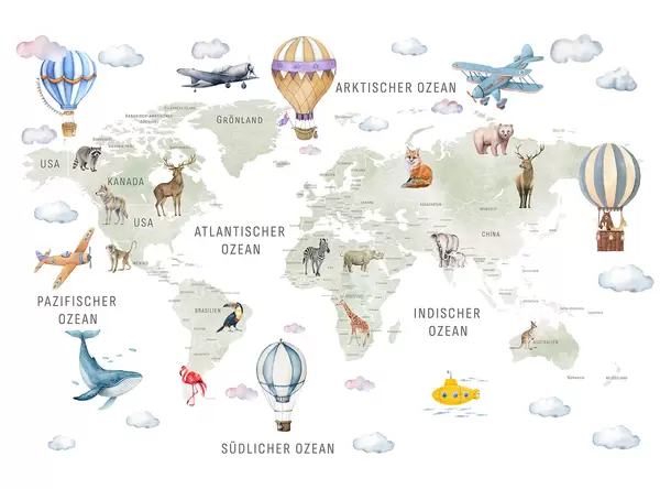 Фототапет Детска карта в акварелен стил с животни и балони с горещ въздух. На немски език. Зелен цвят. Nr c00001de