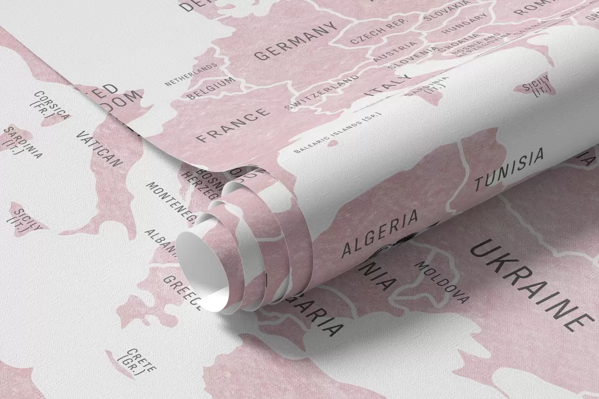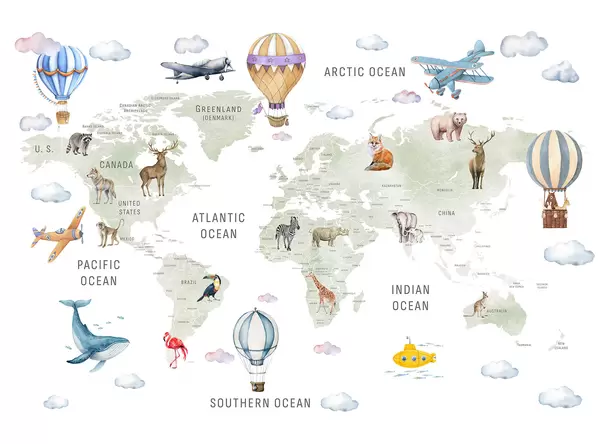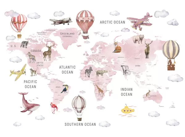 Фототапет Детска карта в акварелен стил с животни и горещи въздушни балони. На английски език. Розов цвят. Nr c00001env3