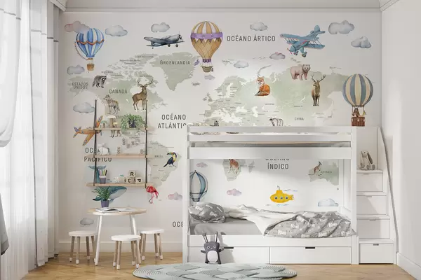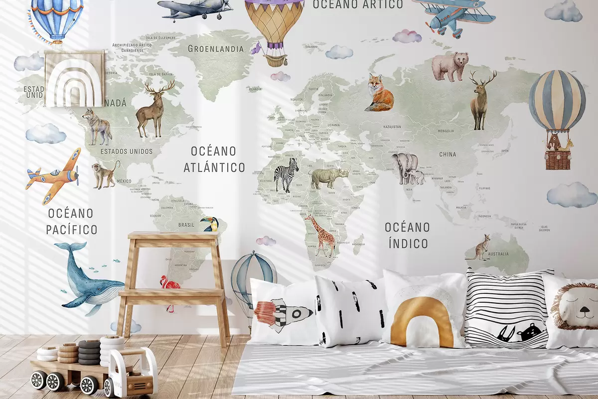 Фототапет Детска карта в акварелен стил с животни и балони с горещ въздух. Испански език. Зелен цвят. Nr c00001es