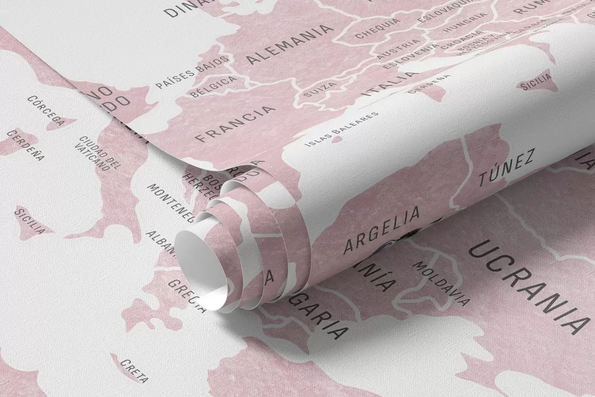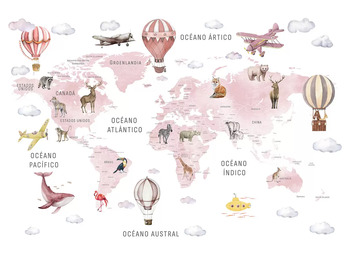 Фототапет Детска карта в акварелен стил с животни и горещи въздушни балони. На испански език. Розов цвят. Nr c00001esv3