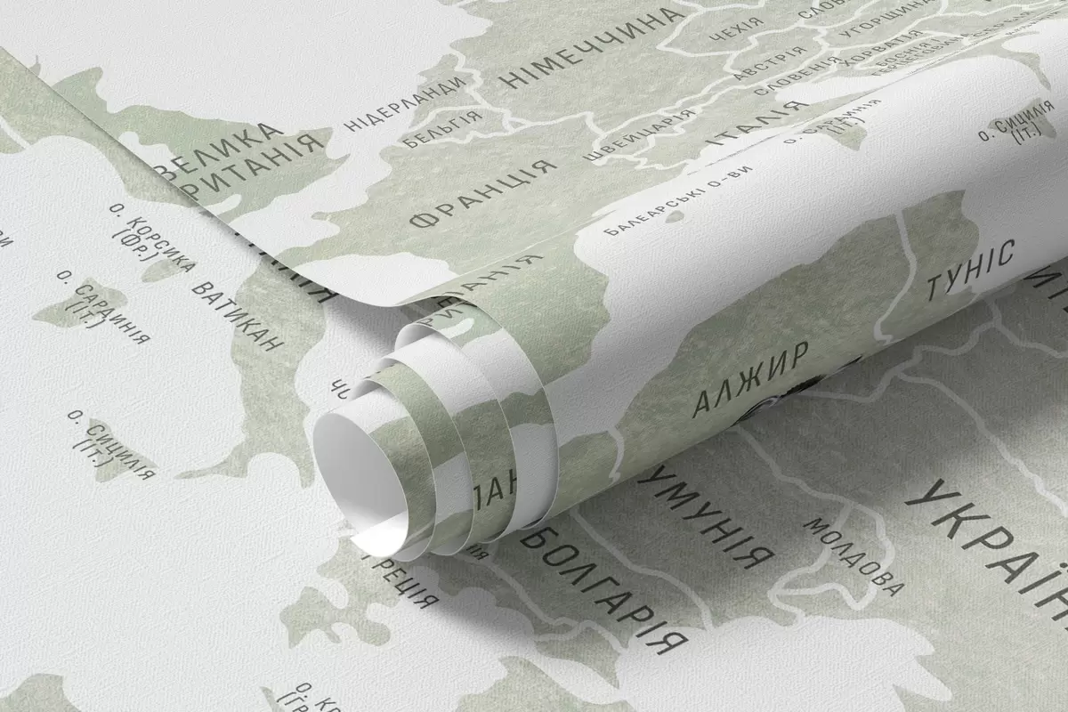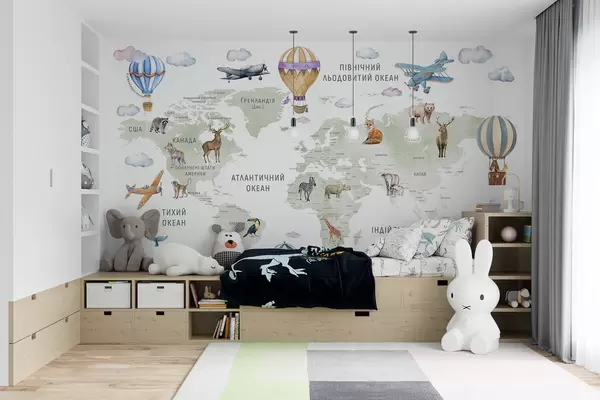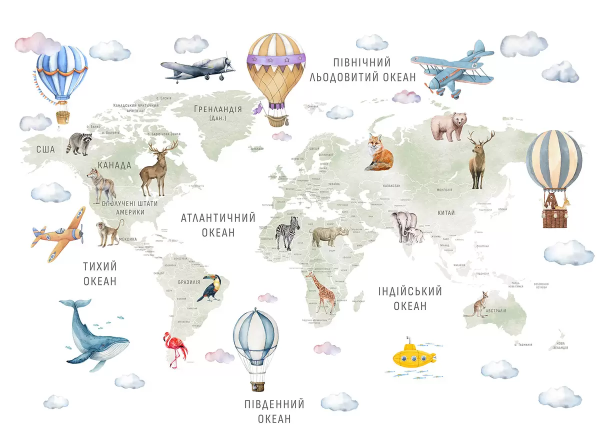 Фототапет Детска карта в акварелен стил с животни и горещи въздушни балони. Украински език. Зелен цвят. Nr c00001uk