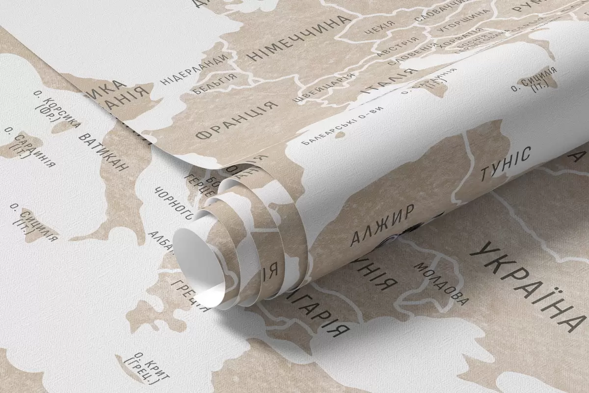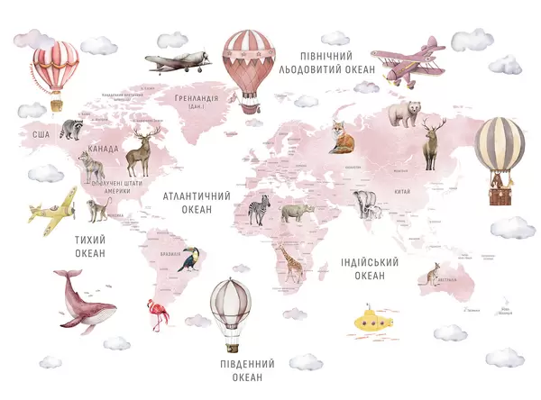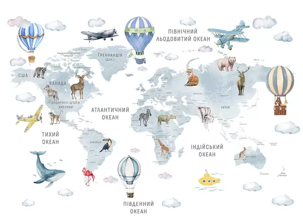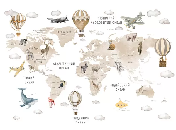 Фототапет Детска карта в акварелен стил с животни и балони с горещ въздух. На украински език. Цвят бежов. Nr c00001ukv2