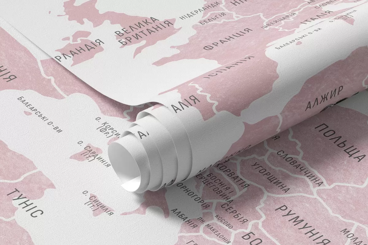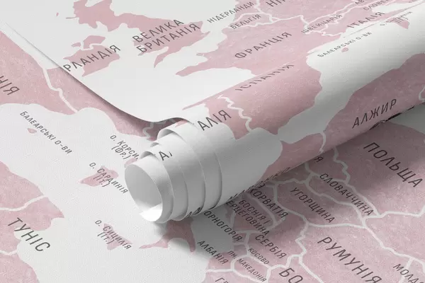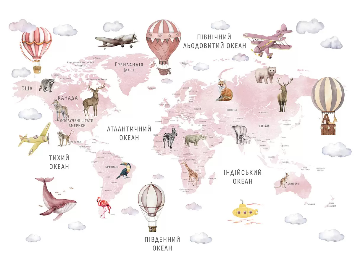 Фототапет Детска карта в акварелен стил с животни и горещи въздушни балони. На украински език. Розов цвят. Nr c00001ukv3