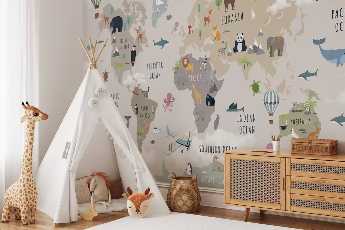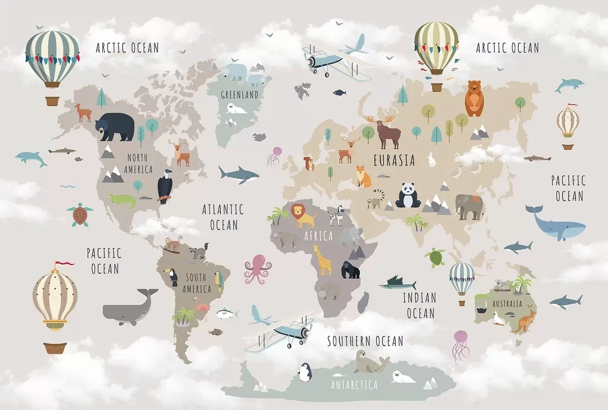Фототапет Детска карта на света с животни и балони с горещ въздух. Английски език Nr c00002en