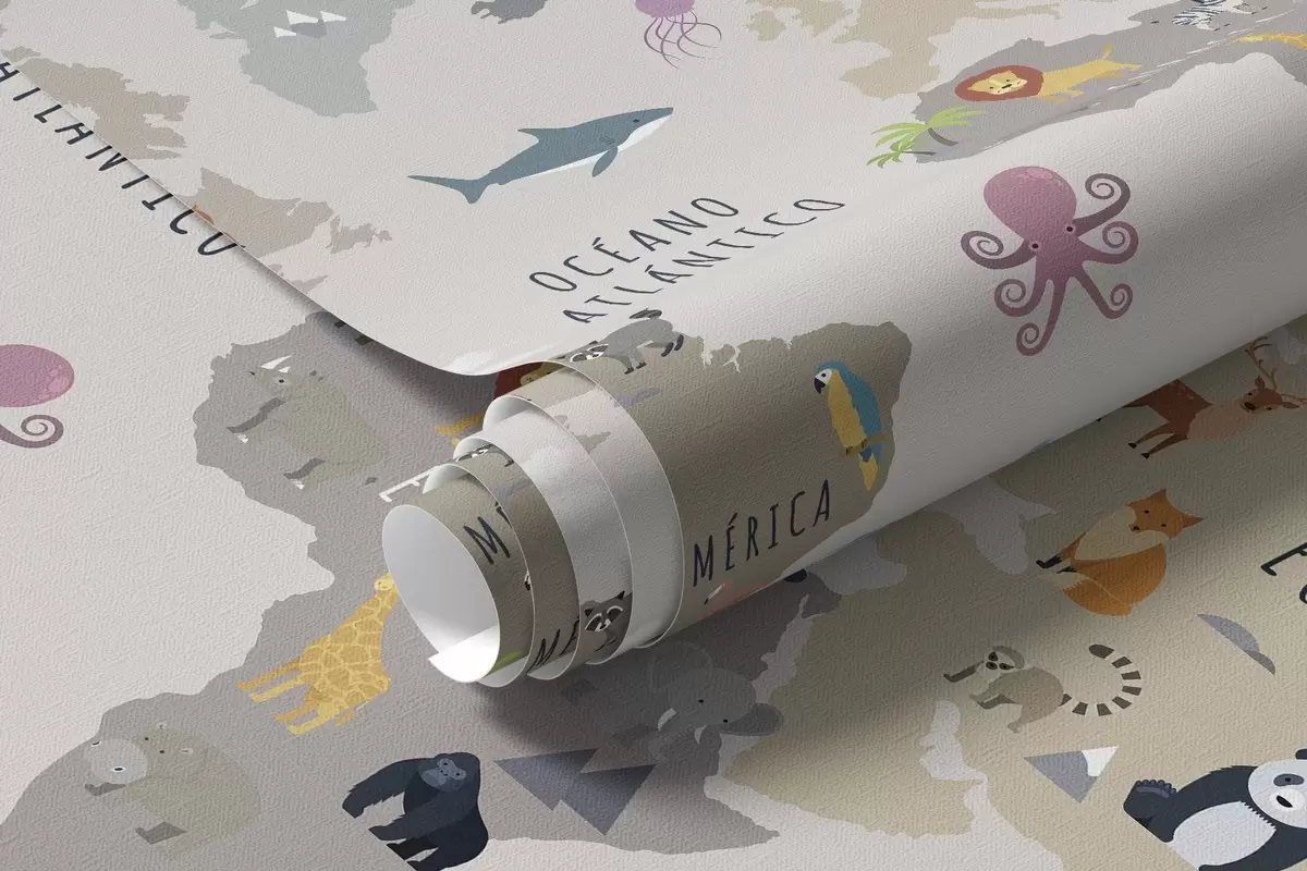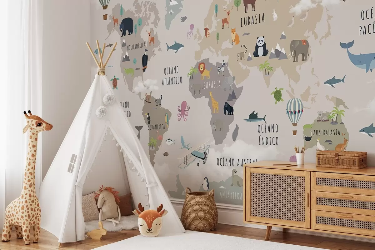 Фототапет Детска карта на света с животни и балони с горещ въздух. Испански език Nr c00002es