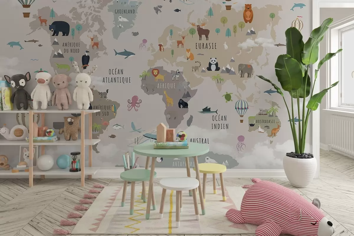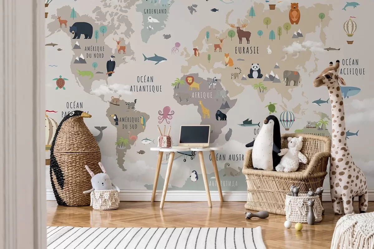 Фототапет Детска карта на света с животни и горещи въздушни балони. Френски език Nr c00002fr