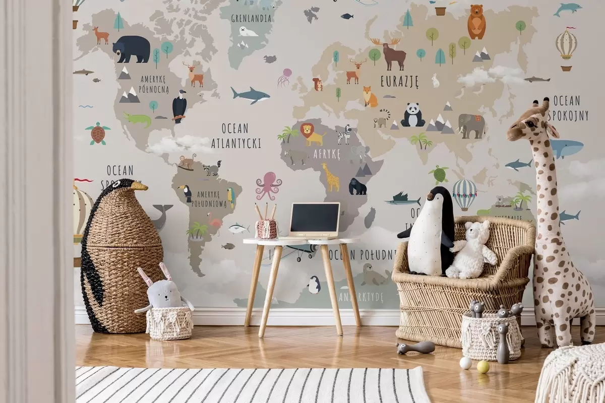 Фототапет Детска карта на света с животни и балони с горещ въздух. Полски език Nr c00002pl