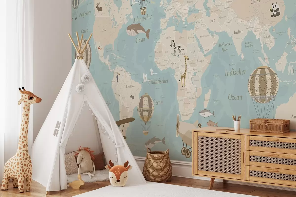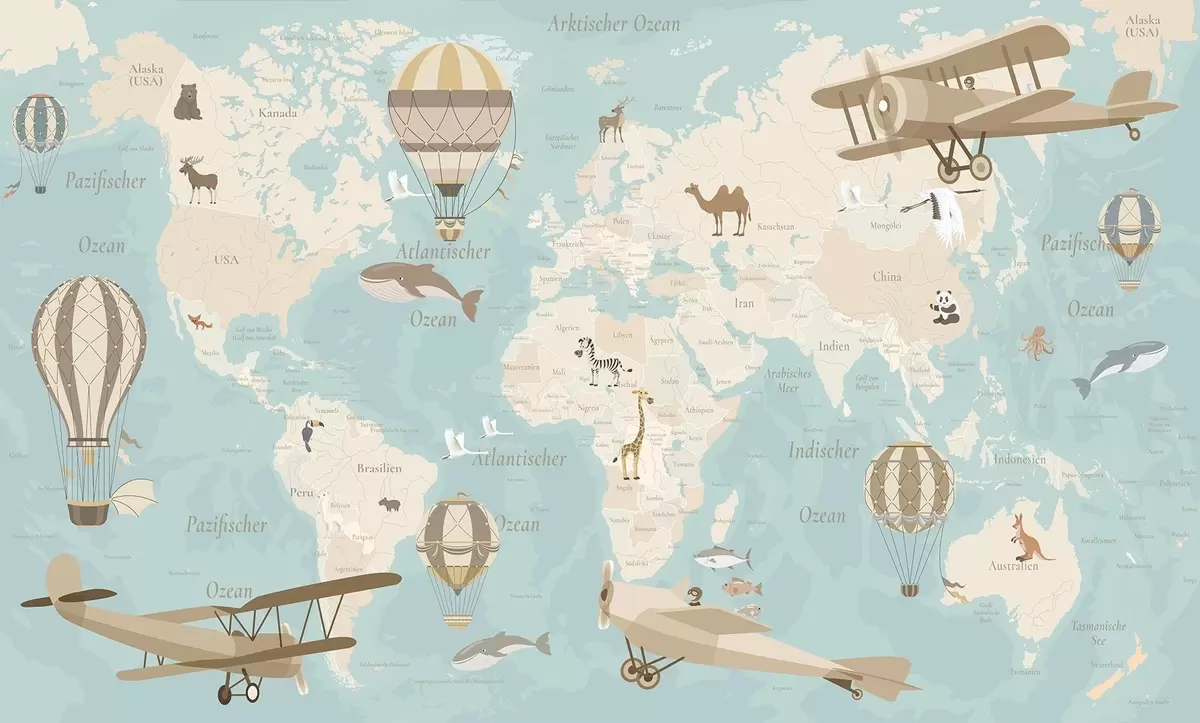 Фототапет Детска карта на света с животни, самолети и балони с горещ въздух. На немски език. Синьо цвят. Nr c00003dev1