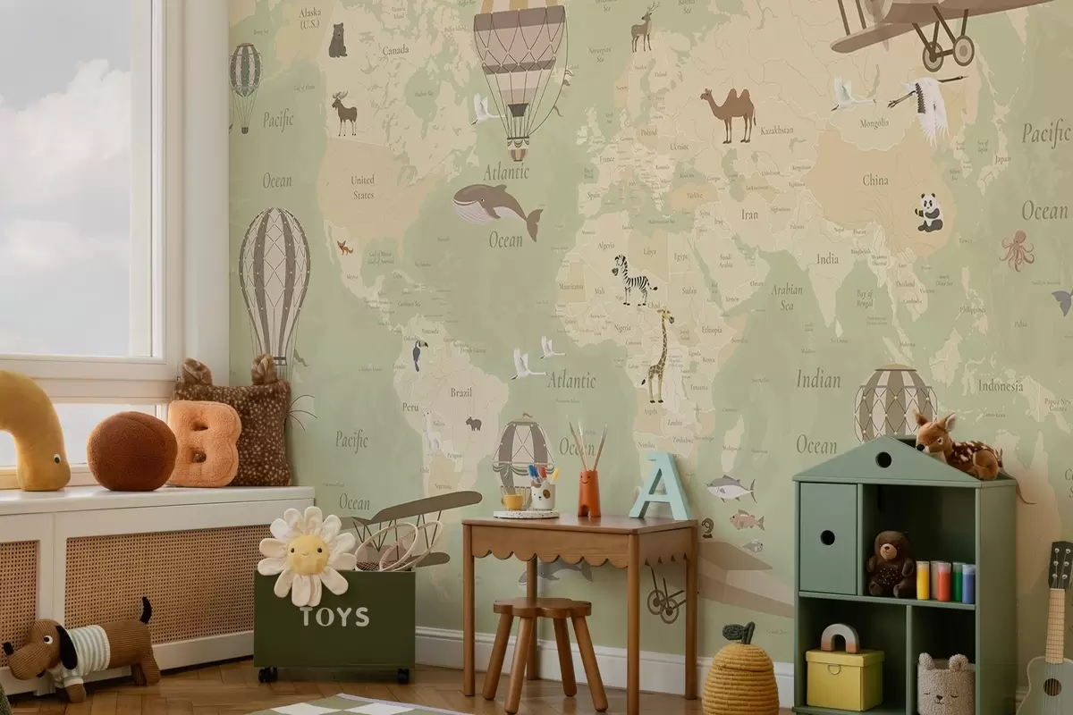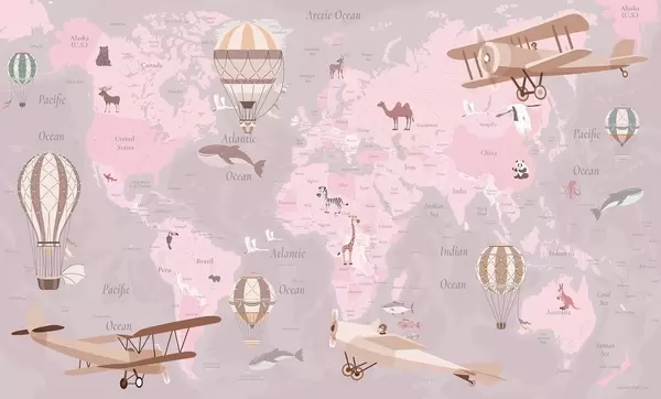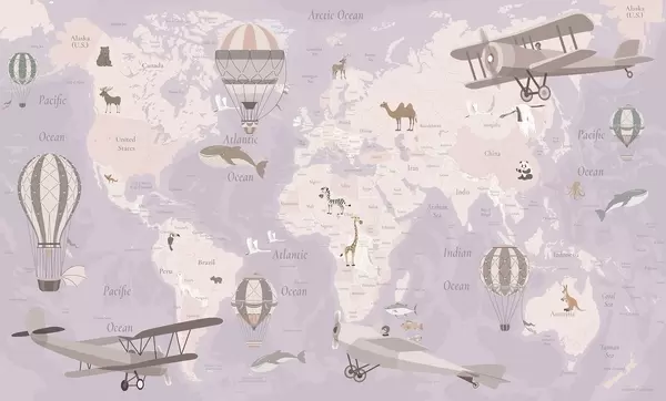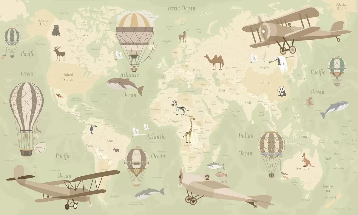Фототапет Детска карта на света с животни, самолети и балони с горещ въздух. На английски език. Зелен цвят. Nr c00003env2