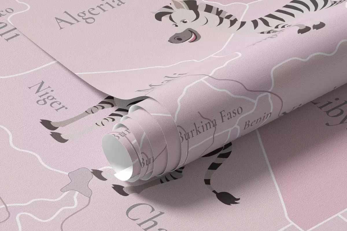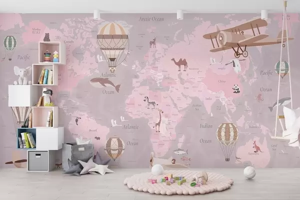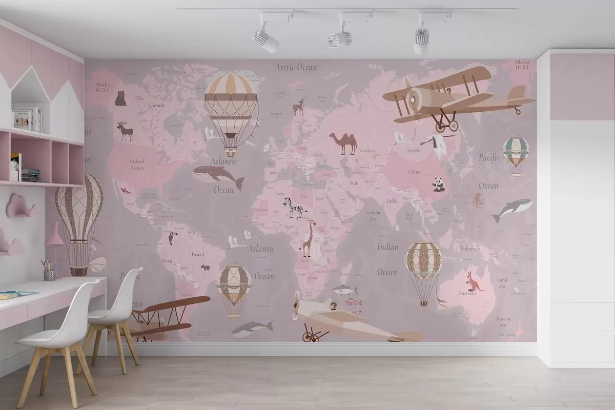 Фототапет Детска карта на света с животни, самолети и балони с горещ въздух. На английски език. Розов цвят. Nr c00003env3