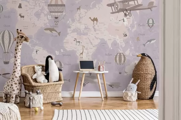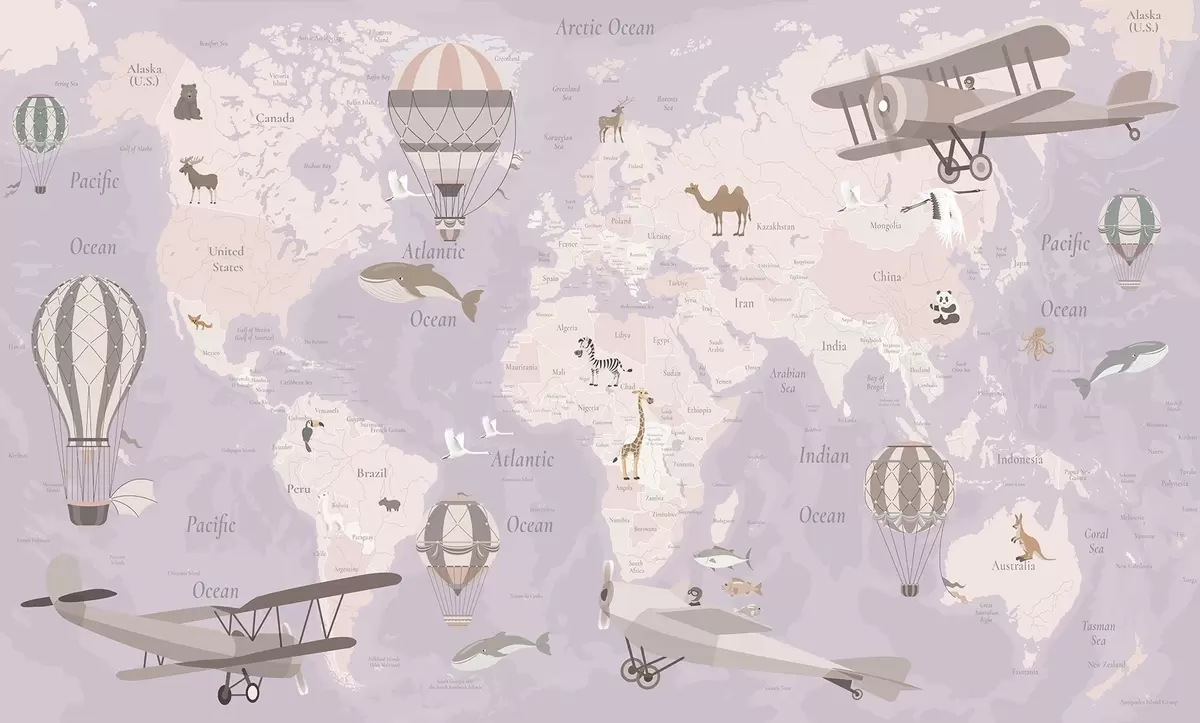 Фототапет Детска карта на света с животни, самолети и балони с горещ въздух. На английски език. Лилав цвят. Nr c00003env4
