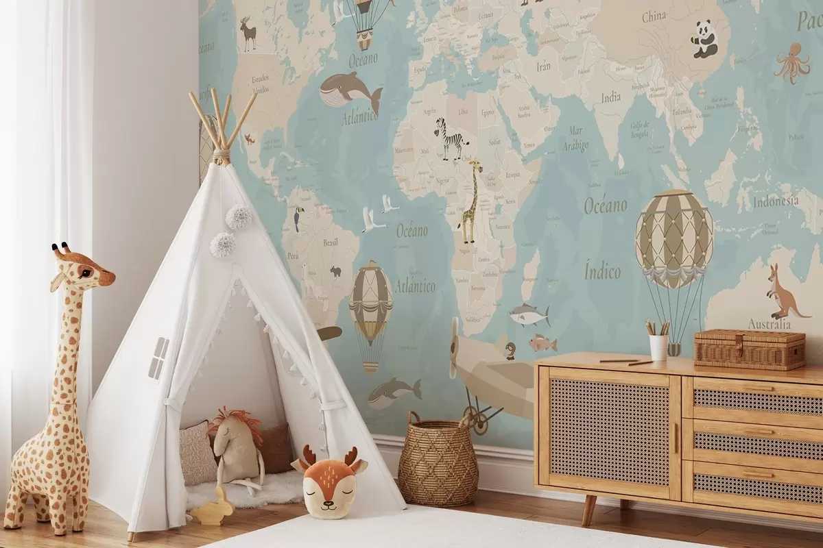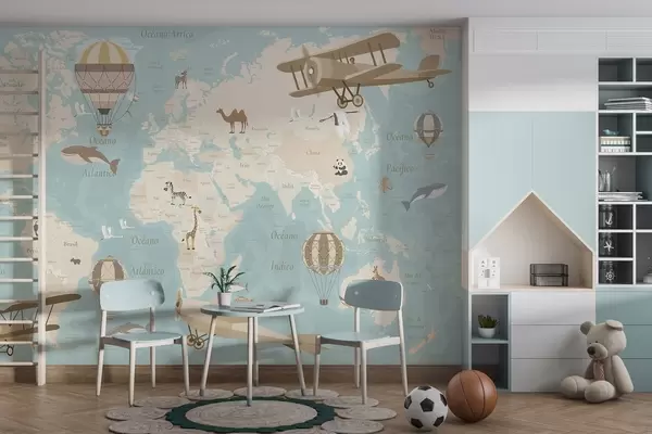 Фототапет Детска карта на света с животни, самолети и балони с горещ въздух. Испански език. Син цвят. Nr c00003esv1