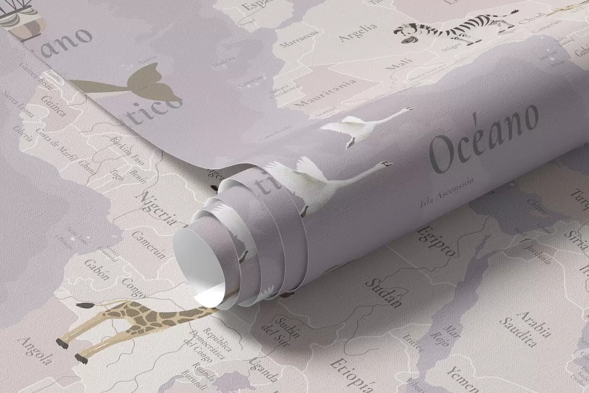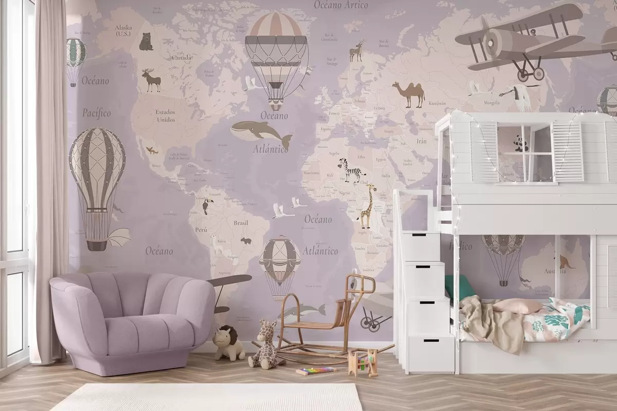 Фототапет Детска карта на света с животни, самолети и балони с горещ въздух. Испански език. Лилав цвят. Nr c00003esv4