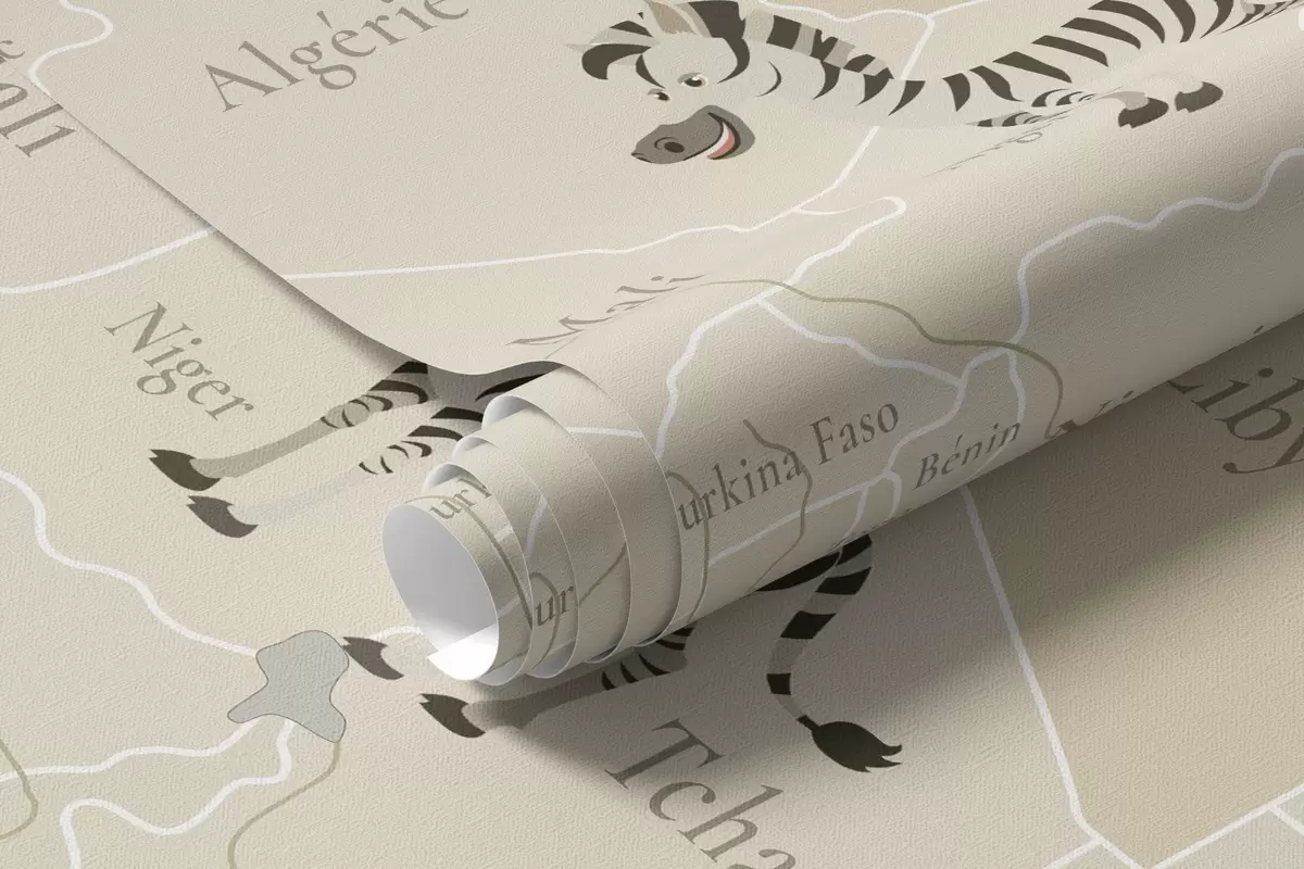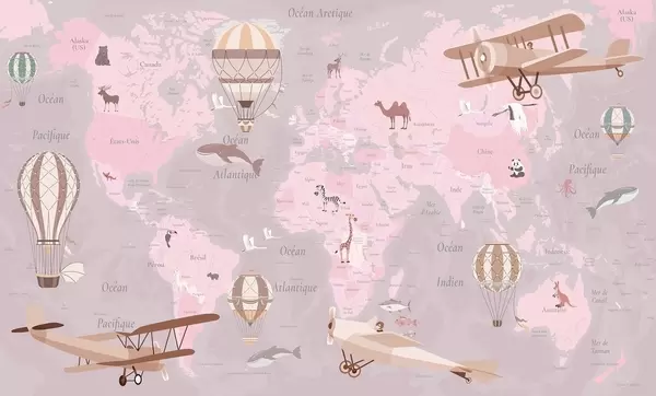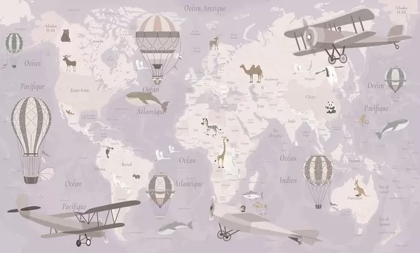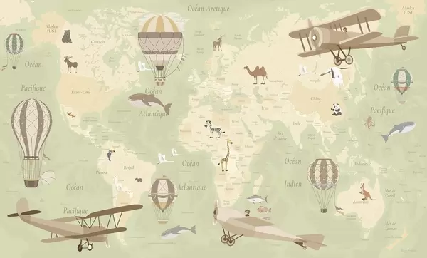 Фототапет Детска карта на света с животни, самолети и балони с горещ въздух. На френски език. Цвят бежов. Nr c00003fr