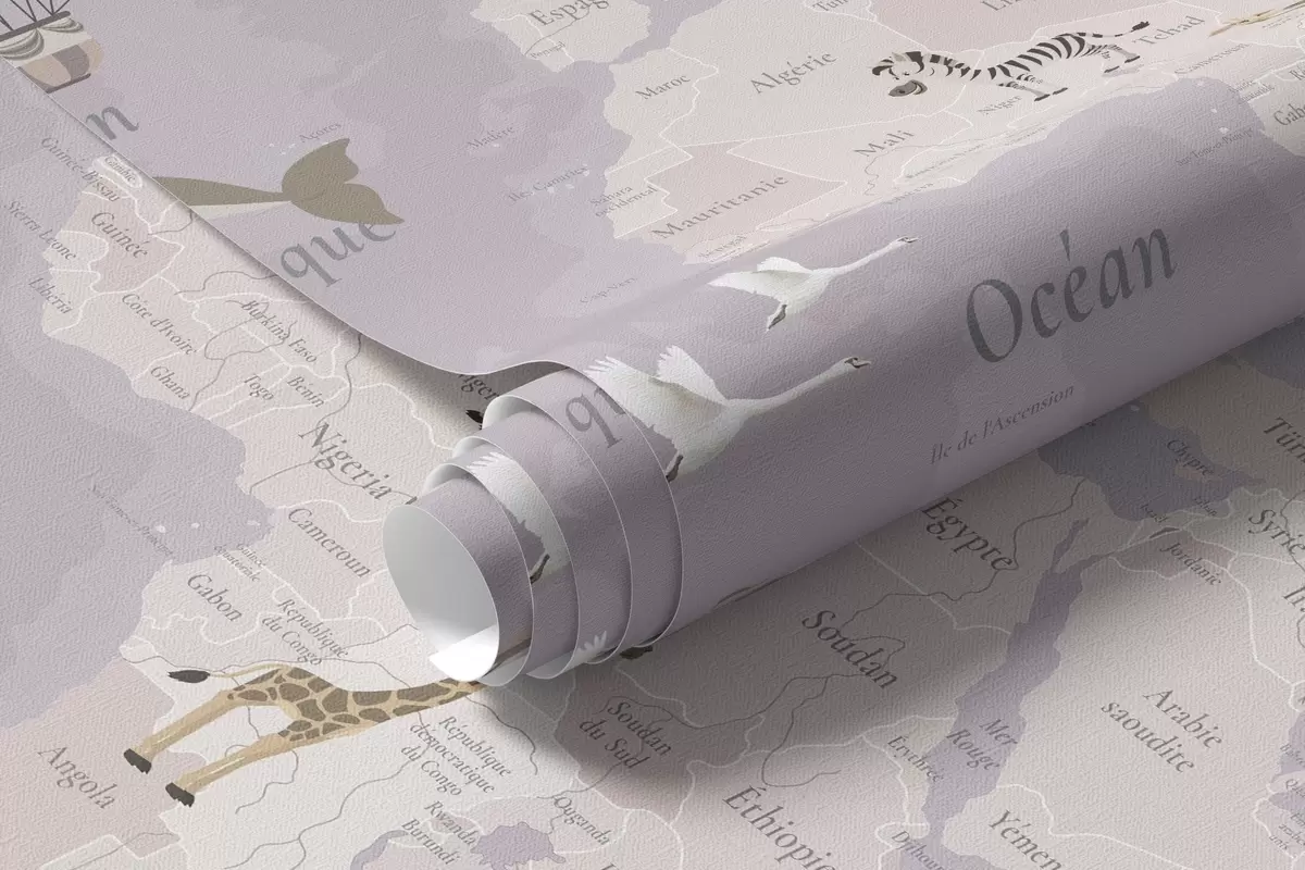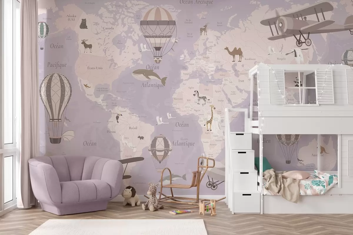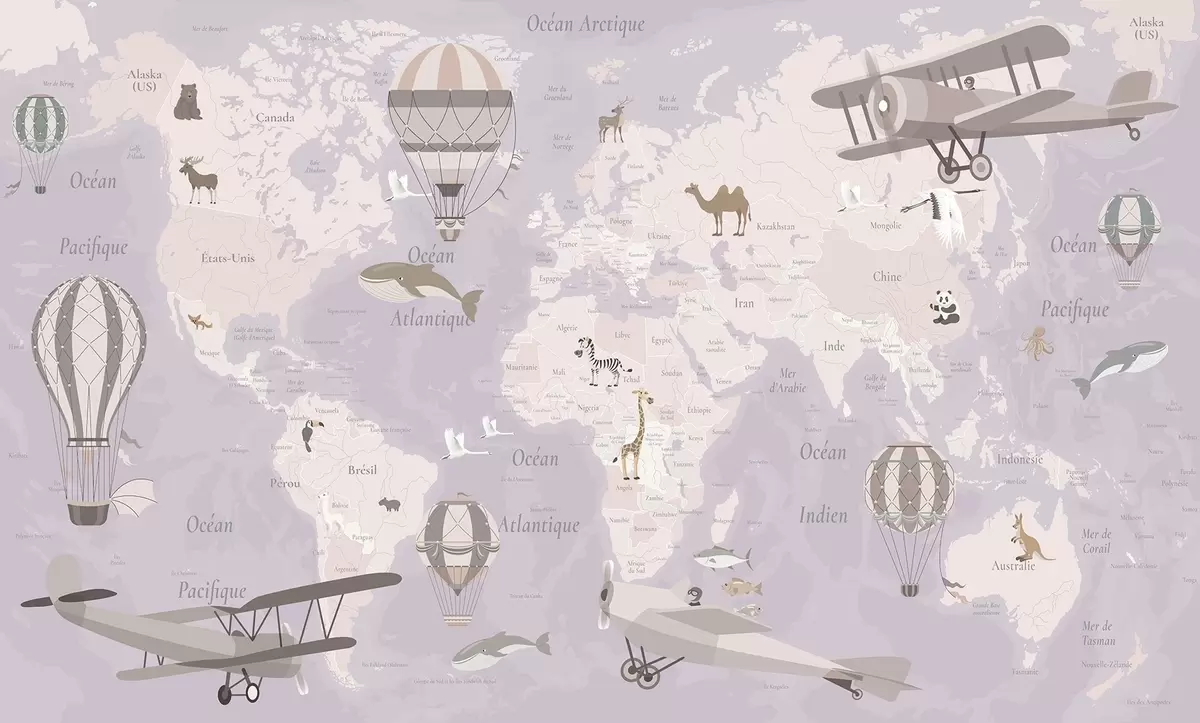 Фототапет Детска карта на света с животни, самолети и балони с горещ въздух. На френски език. Лилав цвят. Nr c00003frv4