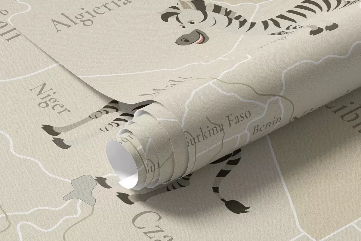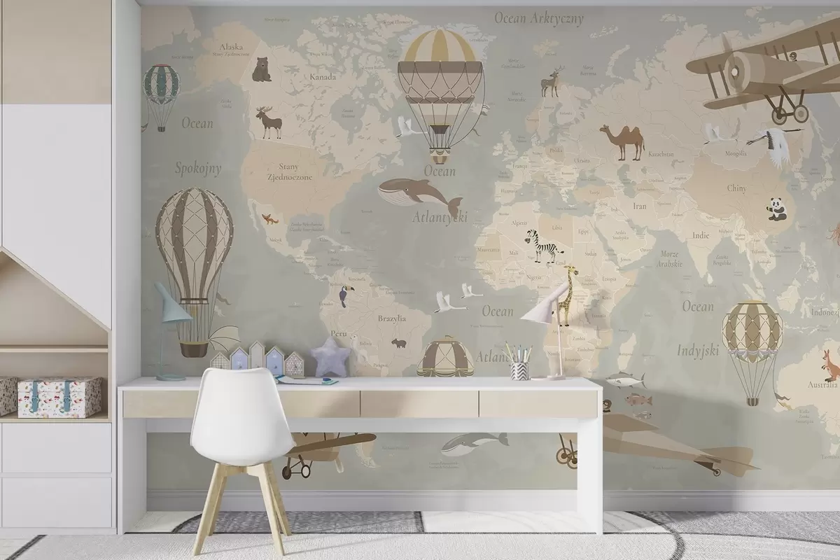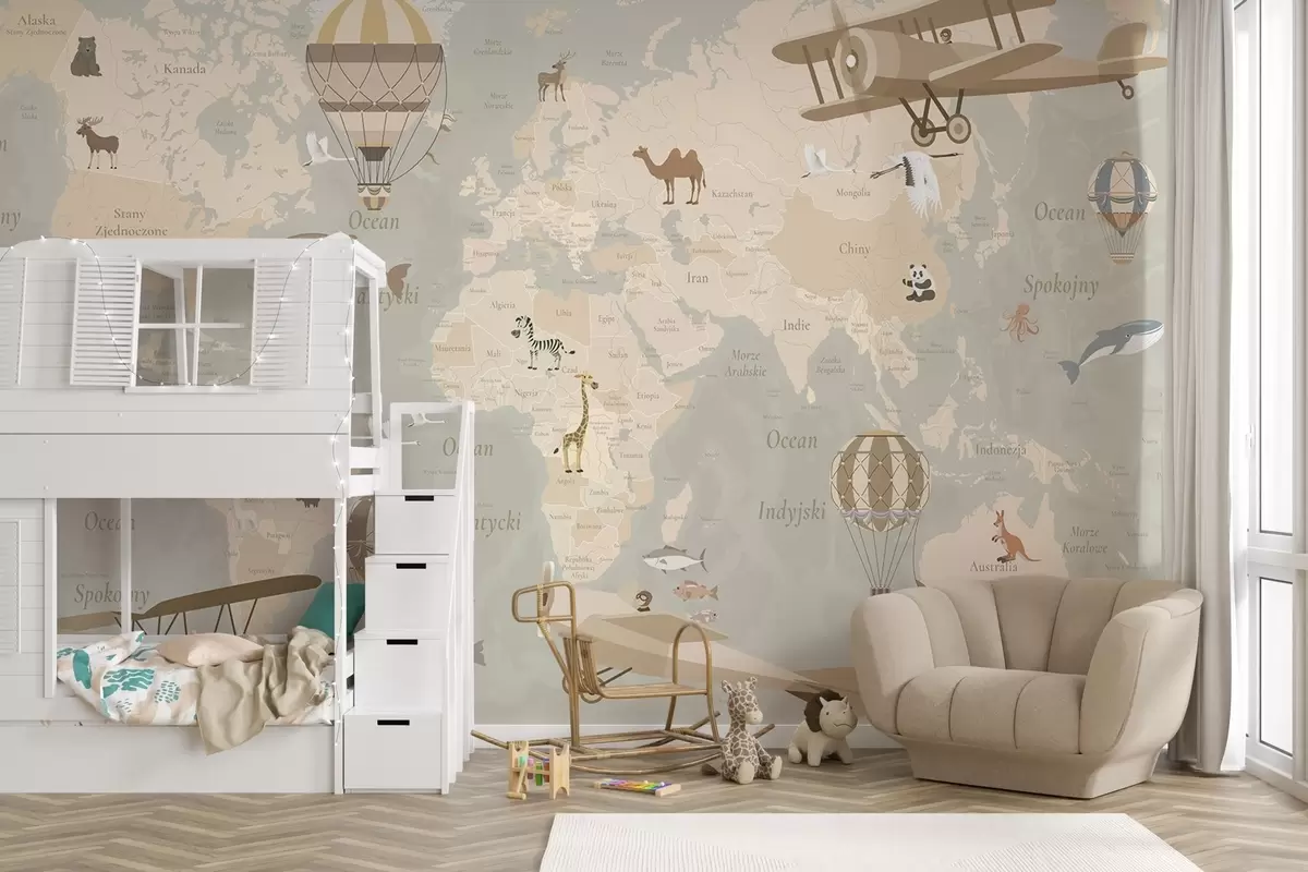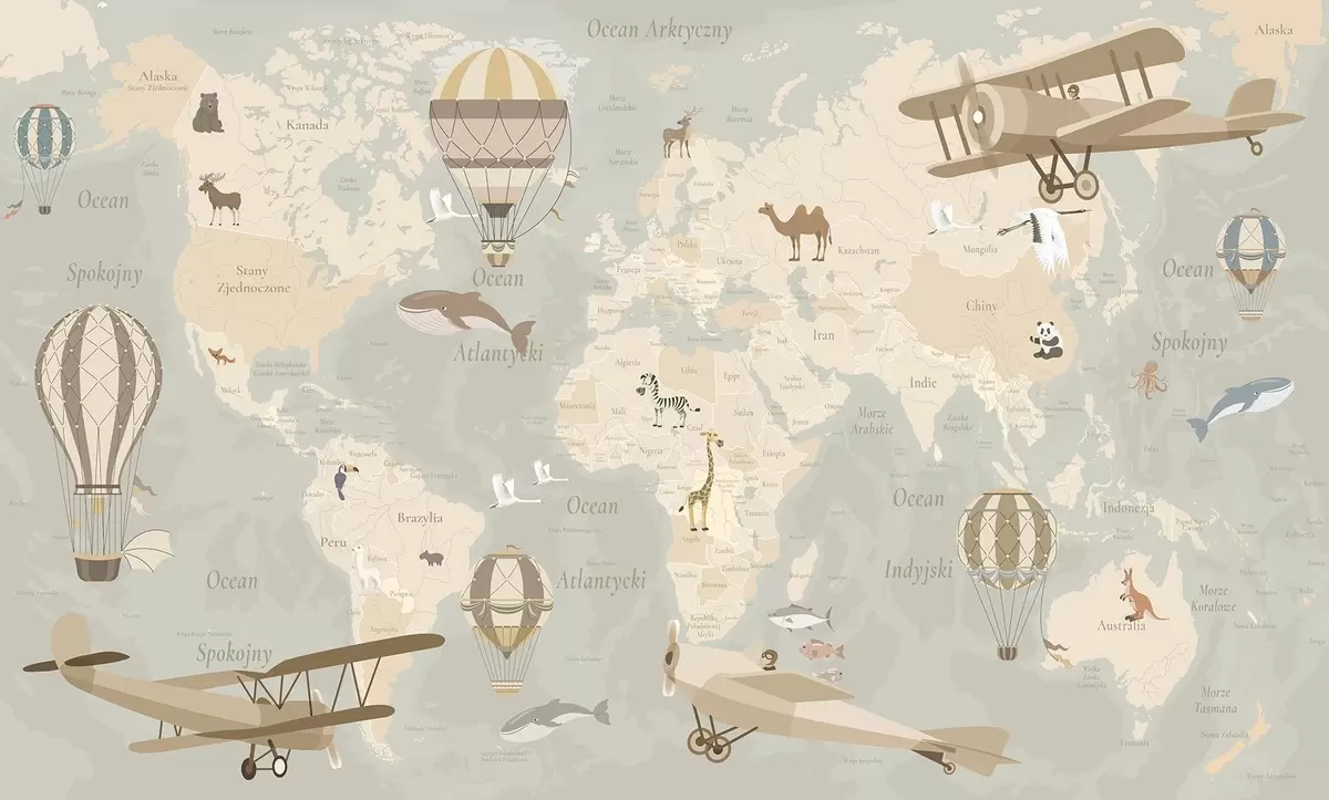 Фототапет Детска карта на света с животни, самолети и балони с горещ въздух. На полски език. Цвят: бежов. Nr c00003pl
