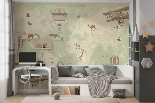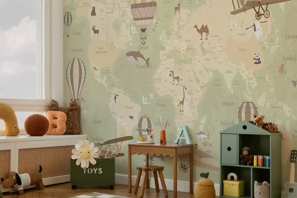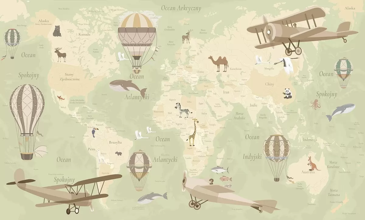 Фототапет Детска карта на света с животни, самолети и балони с горещ въздух. Полски език. Зелен цвят. Nr c00003plv2