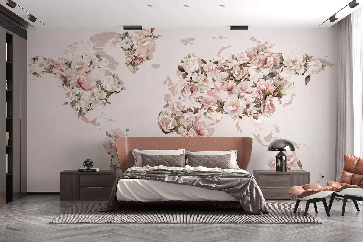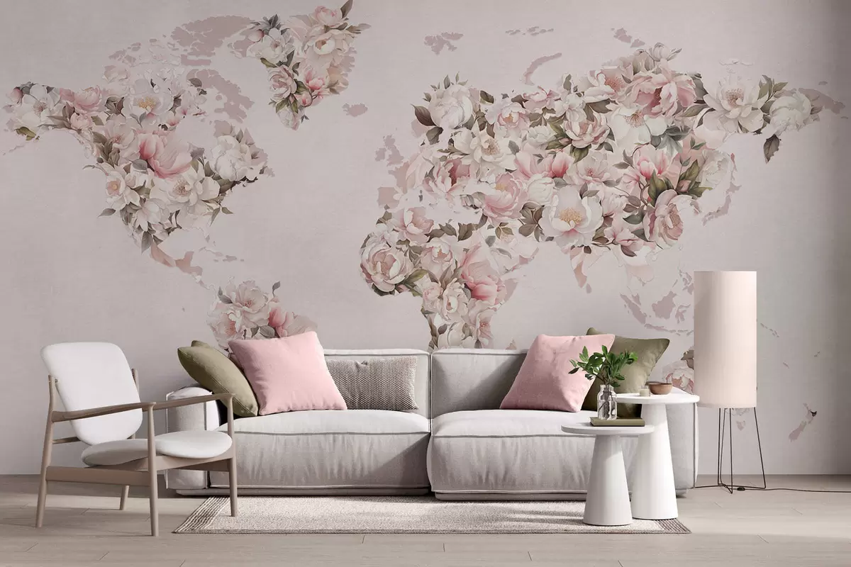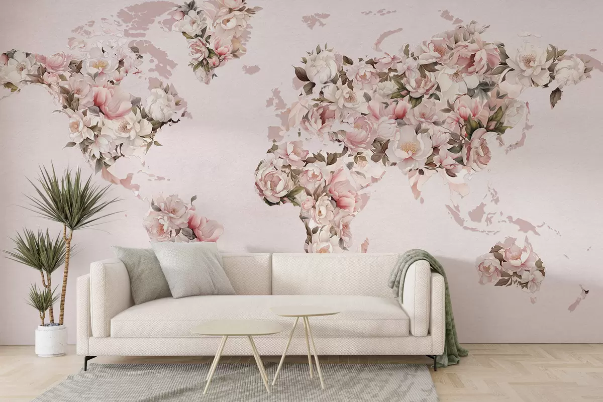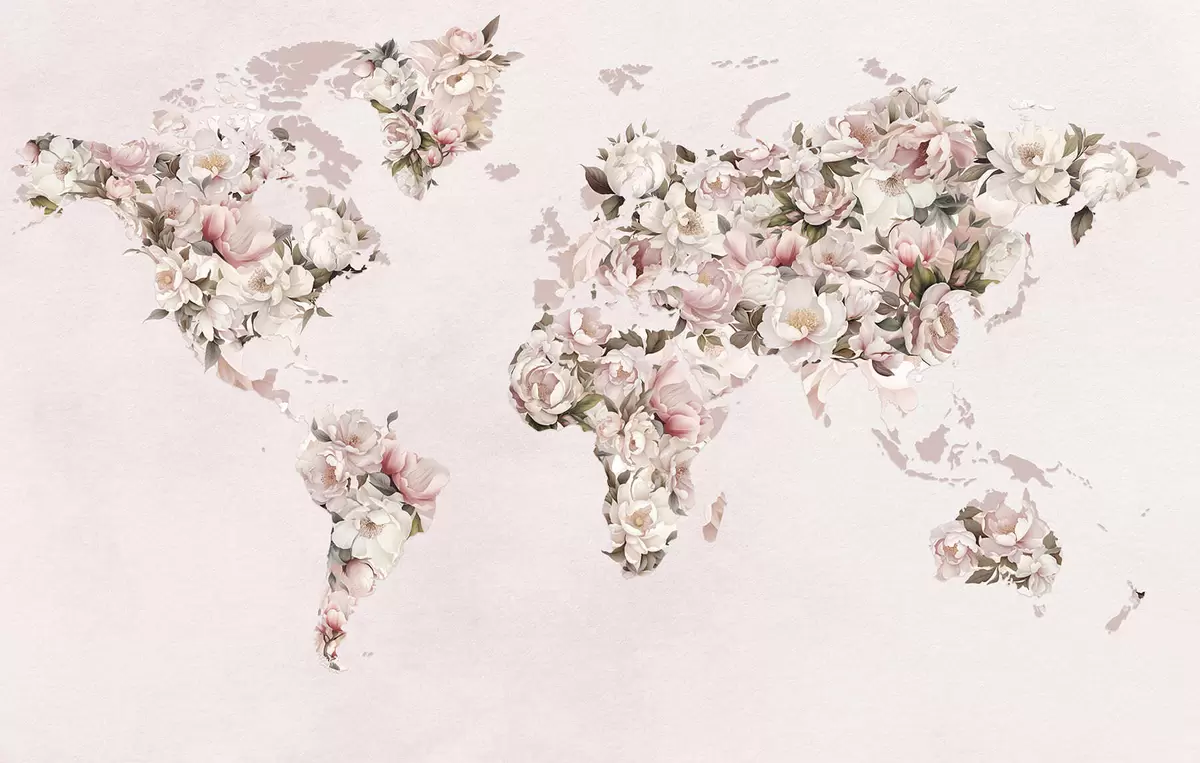 Фототапет Розова карта на света, изработена от големи бели и розови божури Nr c00005