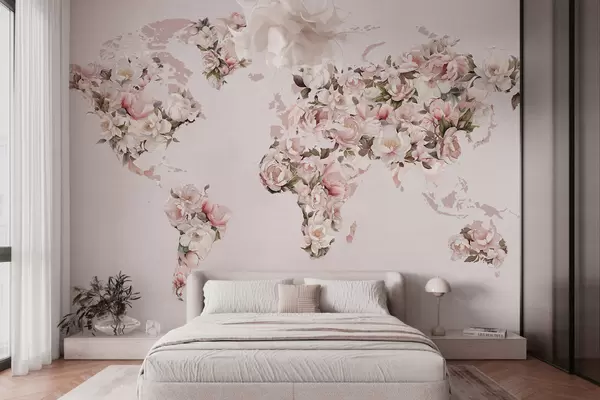 Фототапет Розова карта на света, изработена от големи бели и розови божури Nr c00005