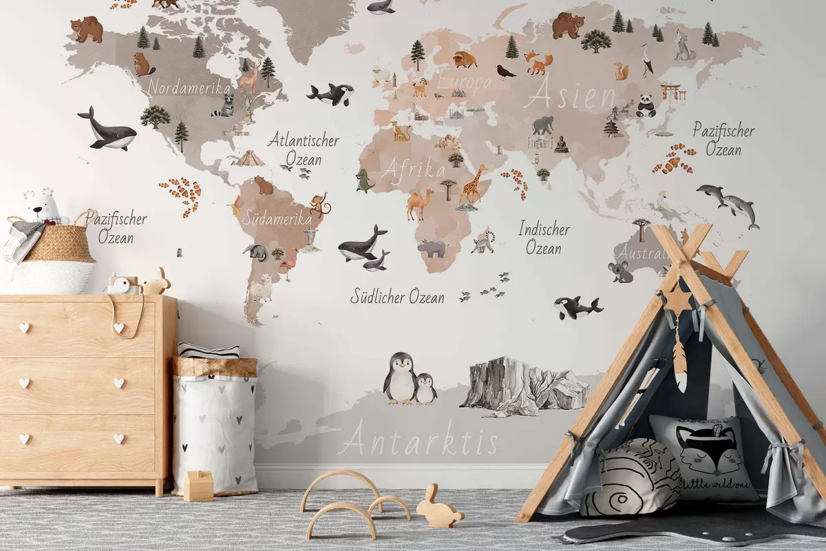 Фототапет Карта в бежови тонове в стил акварел, изобразяваща животни, растения и архитектура. Надписи на немски език Nr c00009dev3