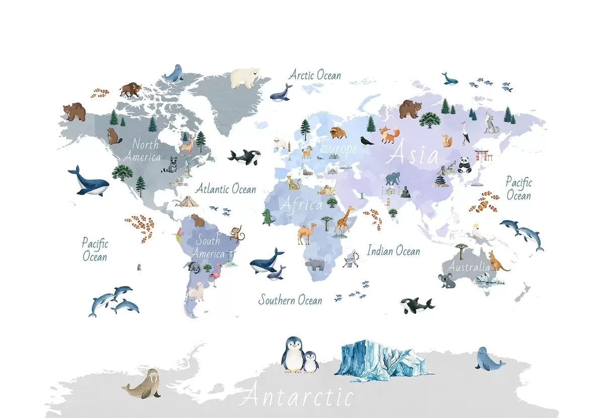 Фототапет Синя карта в стил акварел, изобразяваща животни, растения и архитектура. Надписи на английски език Nr c00009env1