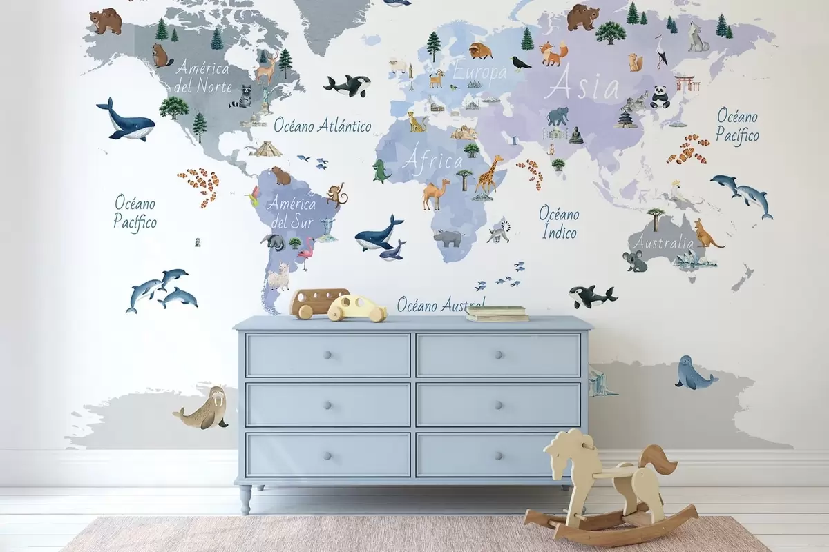 Фототапет Синя карта в акварелен стил, изобразяваща животни, растения и архитектура. Надписи на испански език Nr c00009esv1