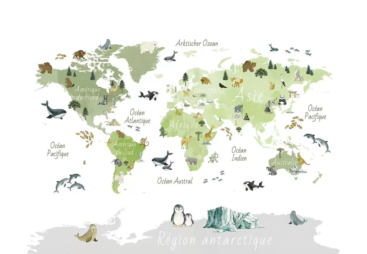 Фототапет Зелена карта в стил акварел, изобразяваща животни, растения и архитектура. Надписи на френски език Nr c00009frv2
