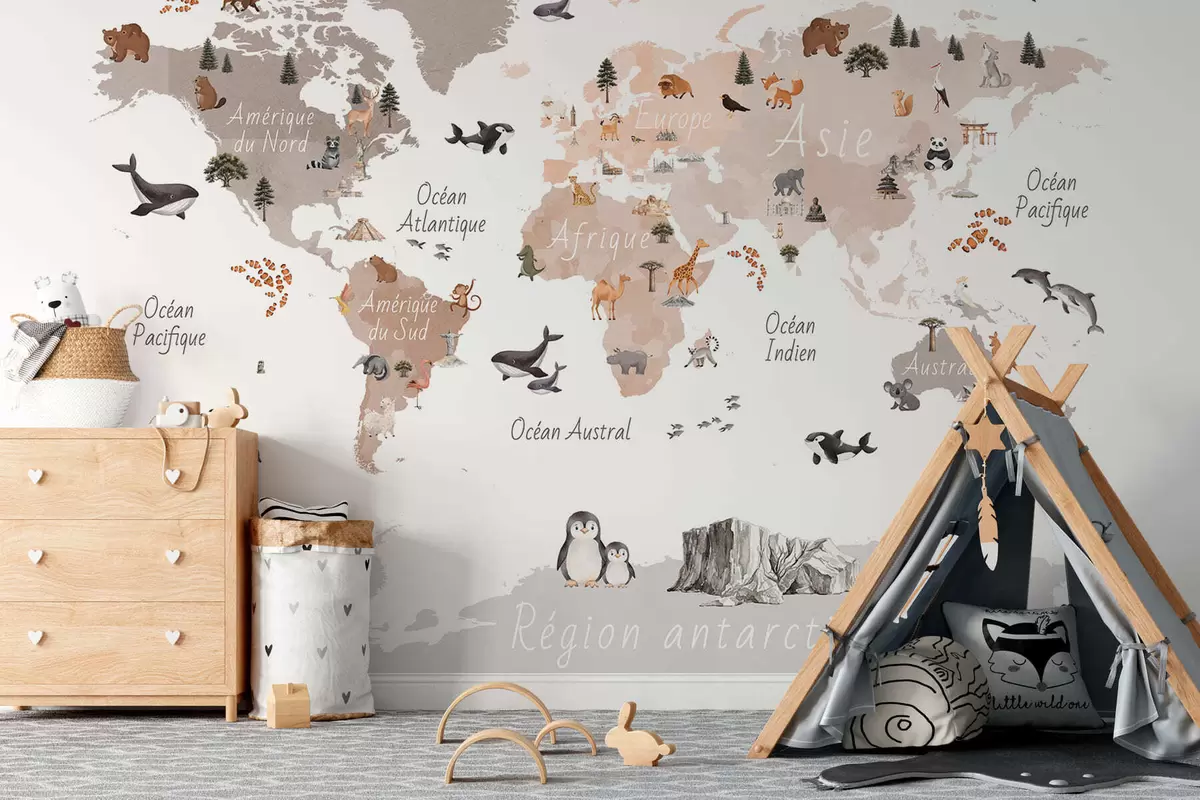 Фототапет Карта в бежови тонове в стил акварел, изобразяваща животни, растения и архитектура. Надписи на френски език Nr c00009frv3