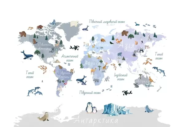 Фототапет Синя карта в акварелен стил, изобразяваща животни, растения и архитектура. Надписи на украински език Nr c00009ukv1