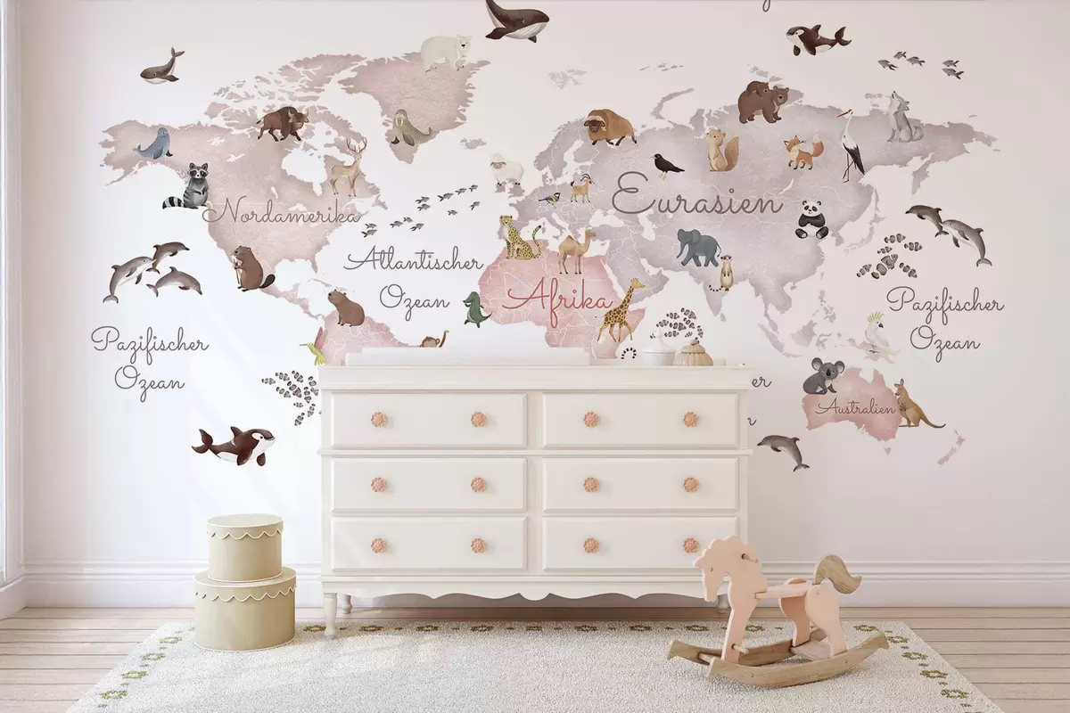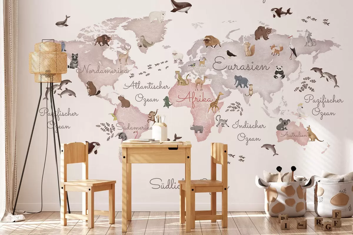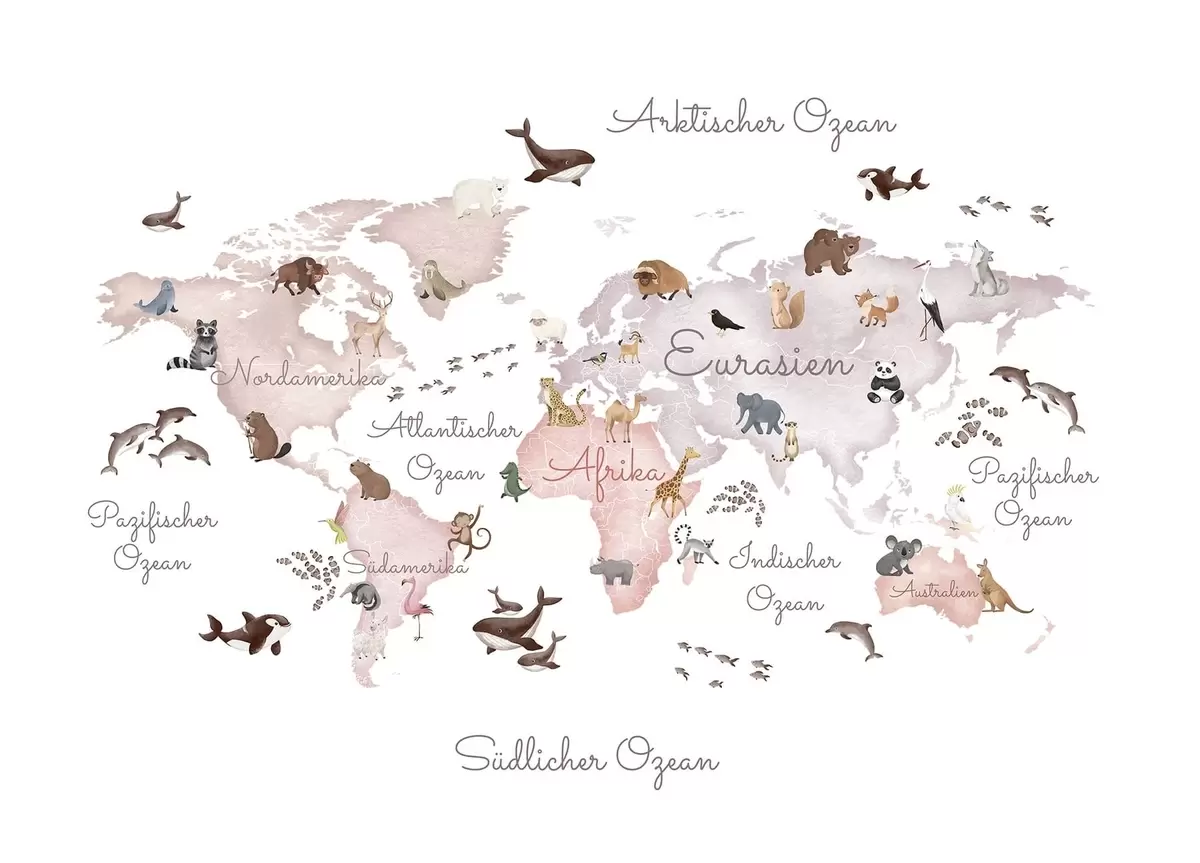 Фототапет Карта в бежови тонове в стил акварел с изображения на животни. Надписи на немски език Nr c00012dev3