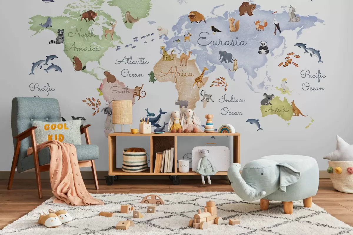 Фототапет Цветна карта в стил акварел с изображения на животни. Надписи на английски език Nr c00012en
