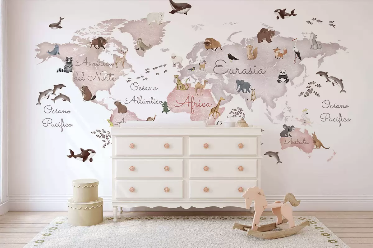 Фототапет Карта в бежови тонове в стил акварел с изображения на животни. Надписи на испански език Nr c00012esv3