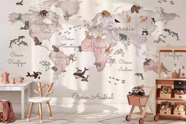 Фототапет Карта в бежови тонове в стил акварел с изображения на животни. Надписи на френски език Nr c00012frv3