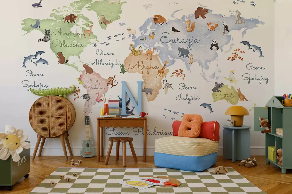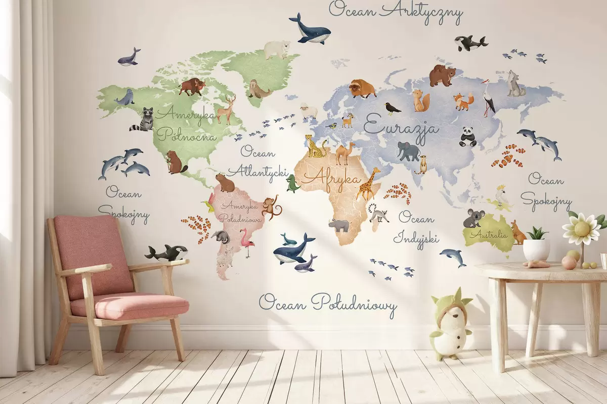 Фототапет Цветна карта в стил акварел с изображения на животни. Надписи на полски език Nr c00012pl