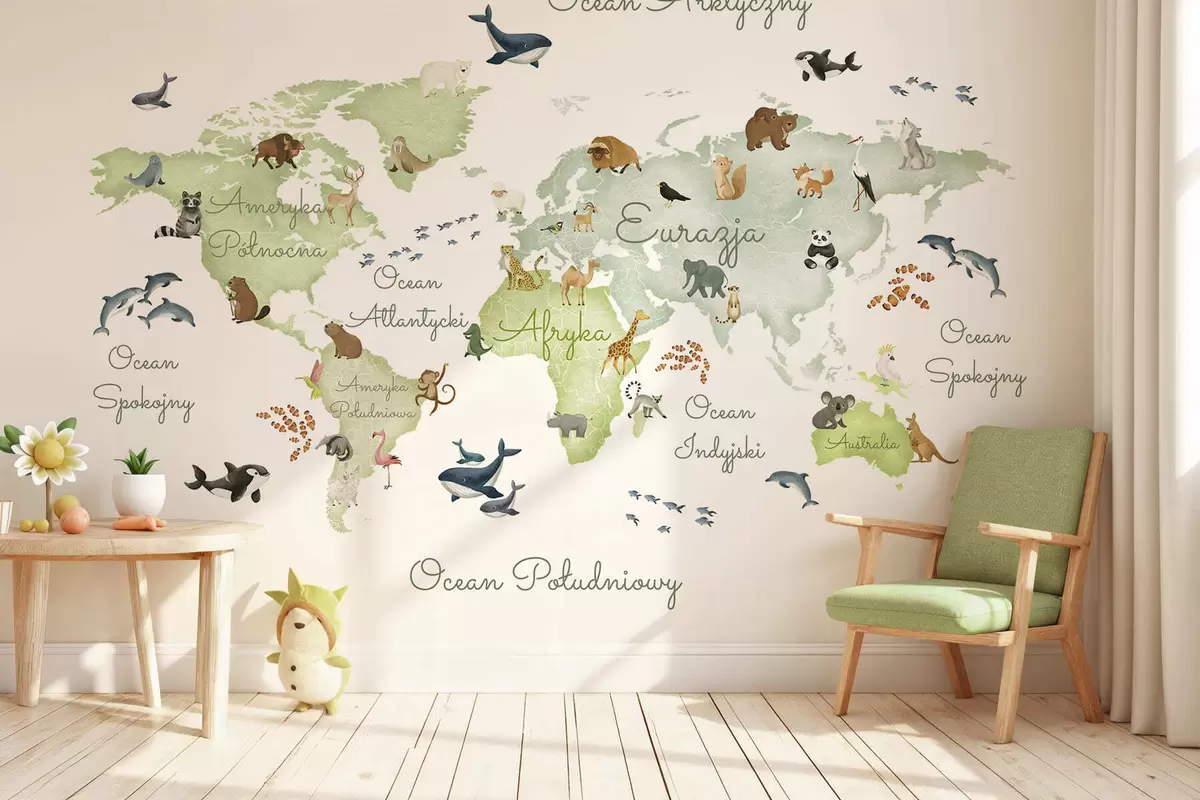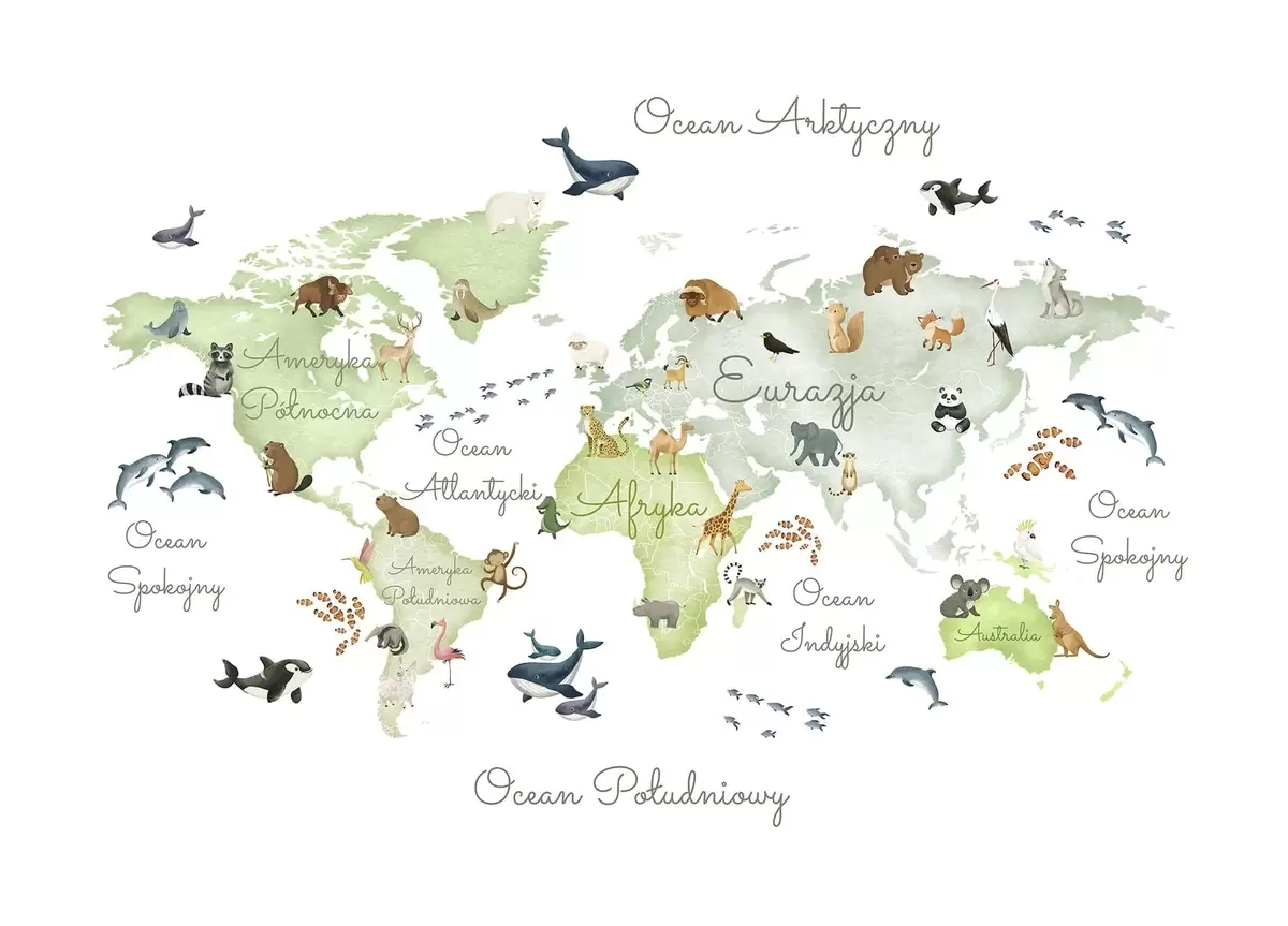 Фототапет Зелена карта в стил акварел с изображения на животни. Надписи на полски език Nr c00012plv2