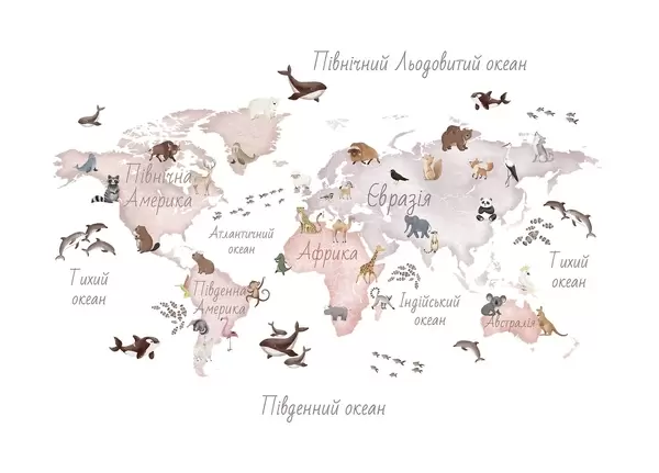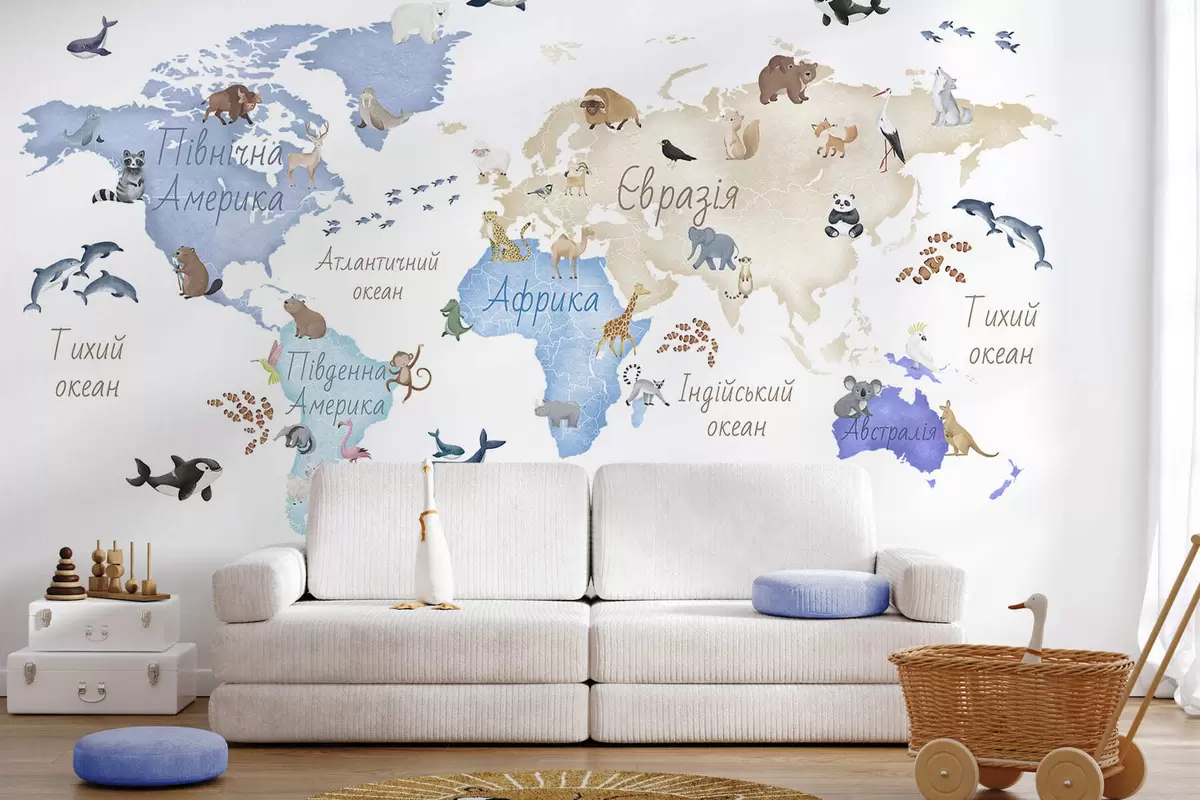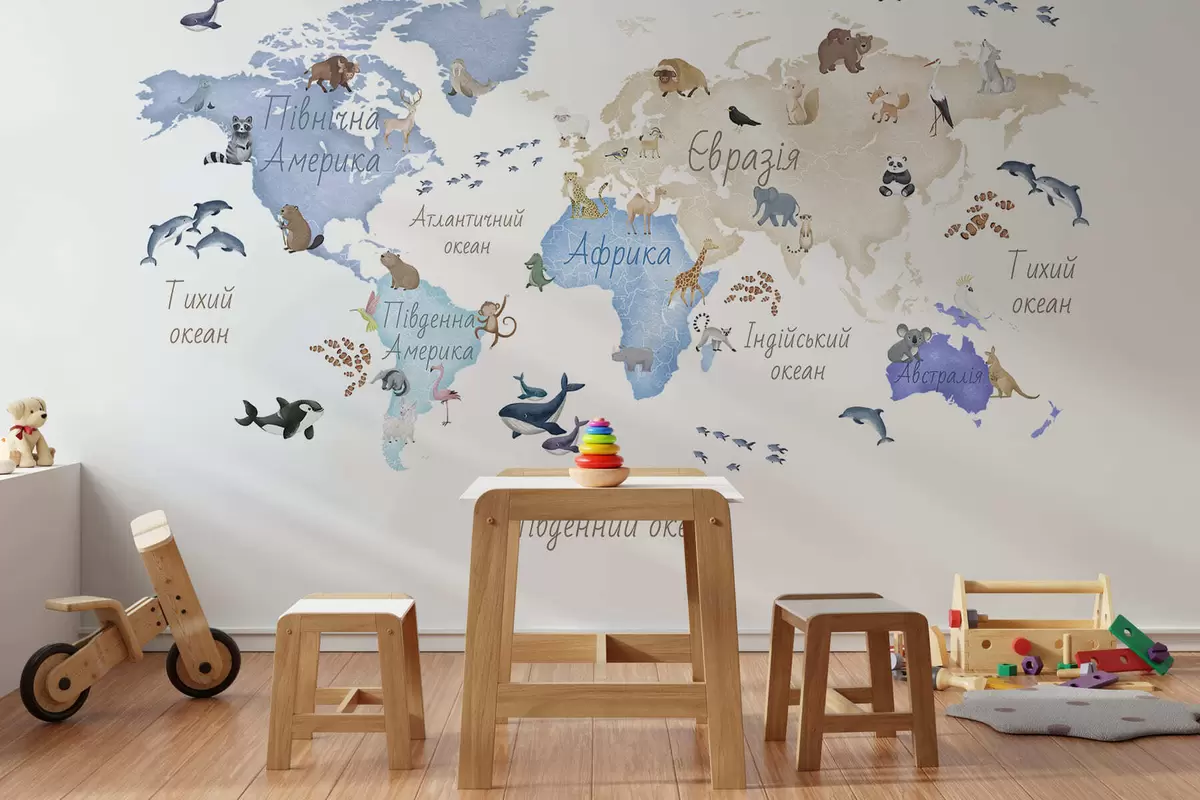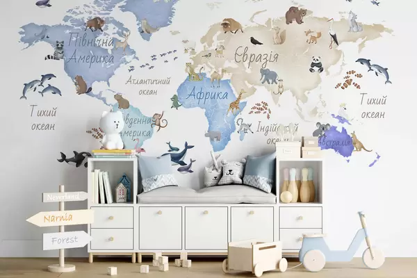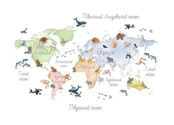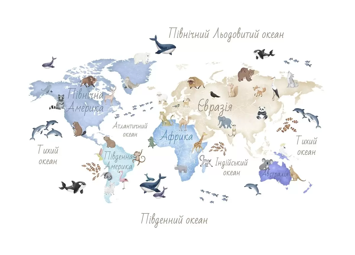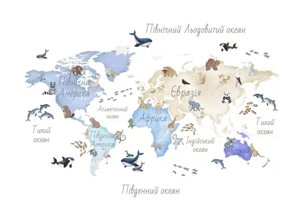 Фототапет Синя карта в акварелен стил с изображения на животни. Надписи на украински език Nr c00012ukv1