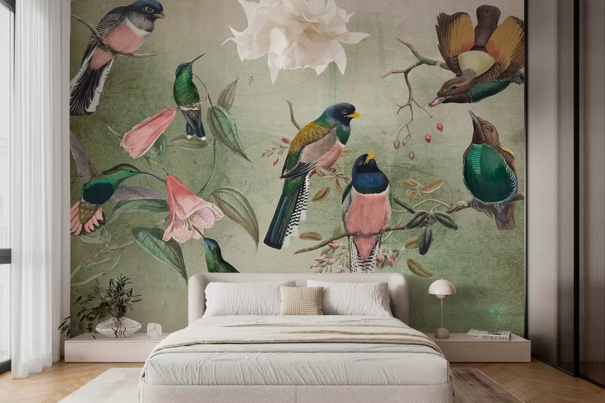 Фототапет Група цветни птици, кацнали на клони на текстуриран фон Nr w00543