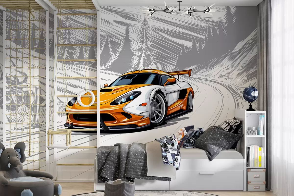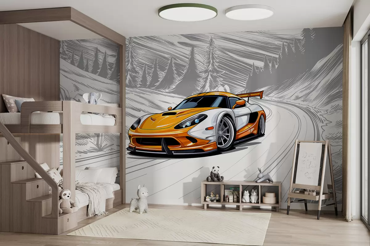 Фототапет Оранжева спортна кола на фона на сив схематичен път сред планини и ели. За декориране на стаята на момче Nr w00954