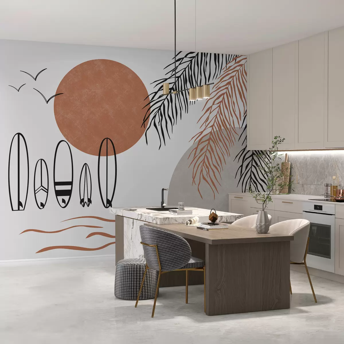 Фототапет Дъски за сърф, чертеж на палмови клони, черен и червен цвят Nr w00958