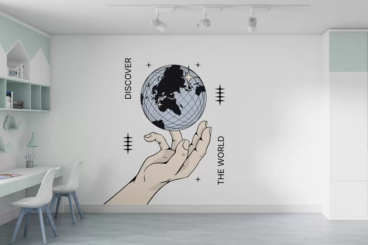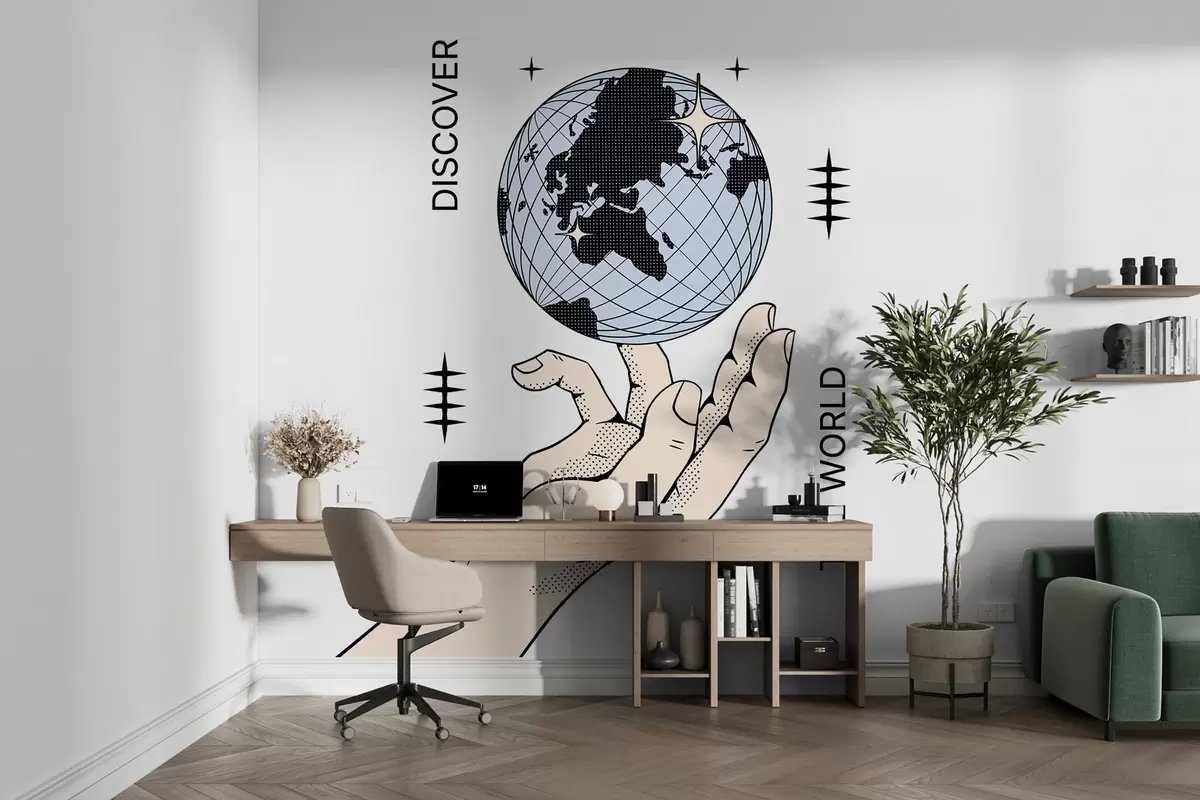 Фототапет Бежова ръка, въртяща глобуса на бял фон за декорация на стая или офис Nr w00984