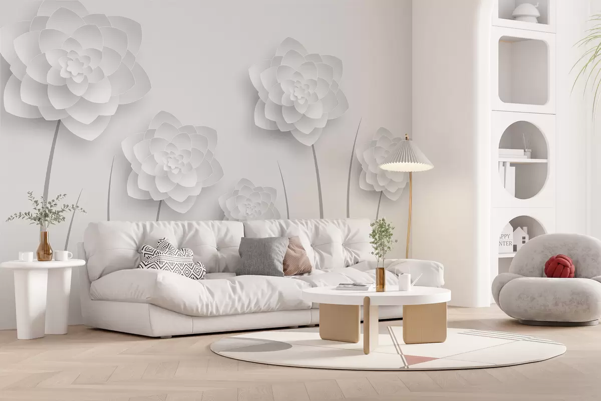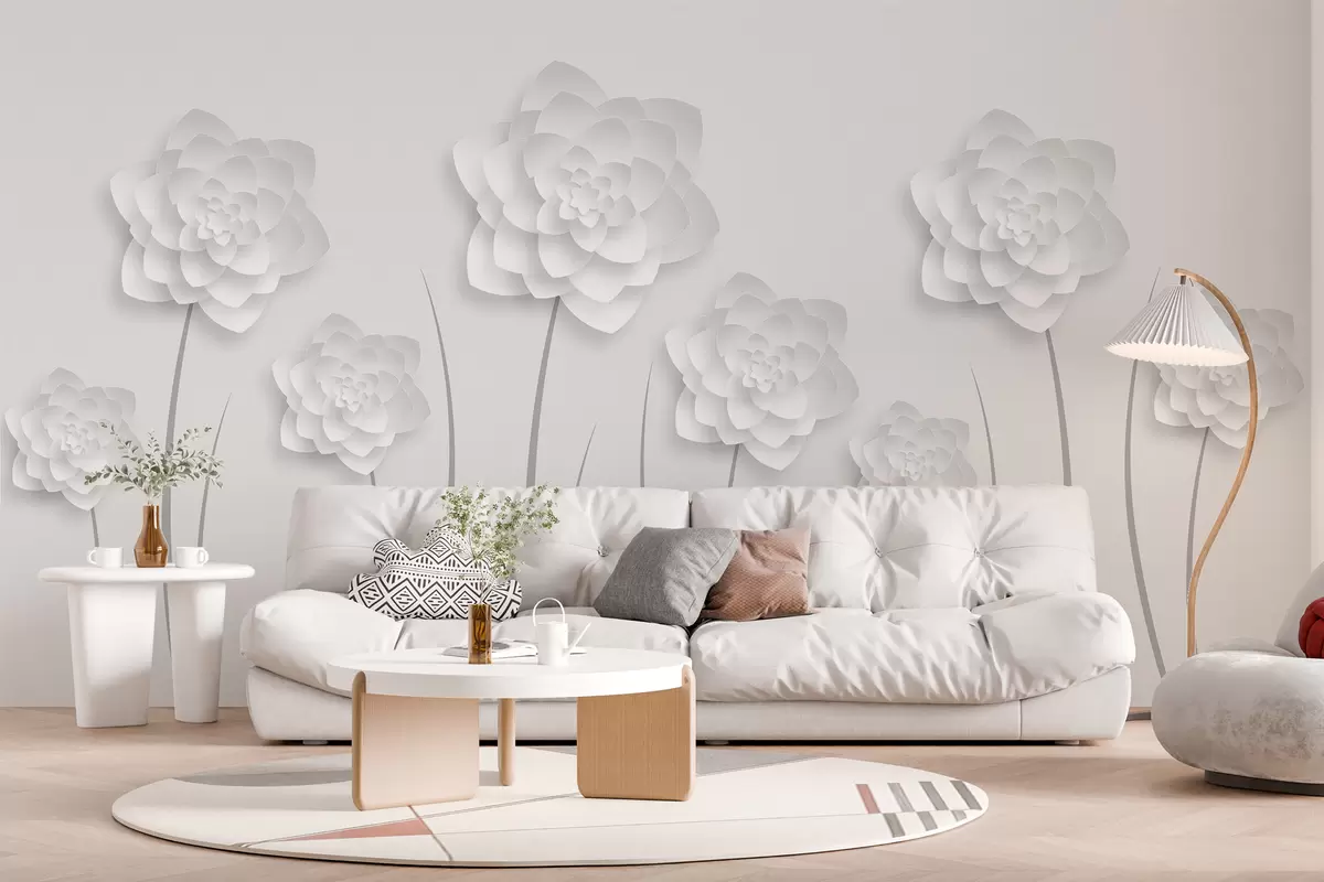 Фототапет Големи цветя с имитация на обем в стил хартия на светло сив фон със сиво стъбло Nr w01021