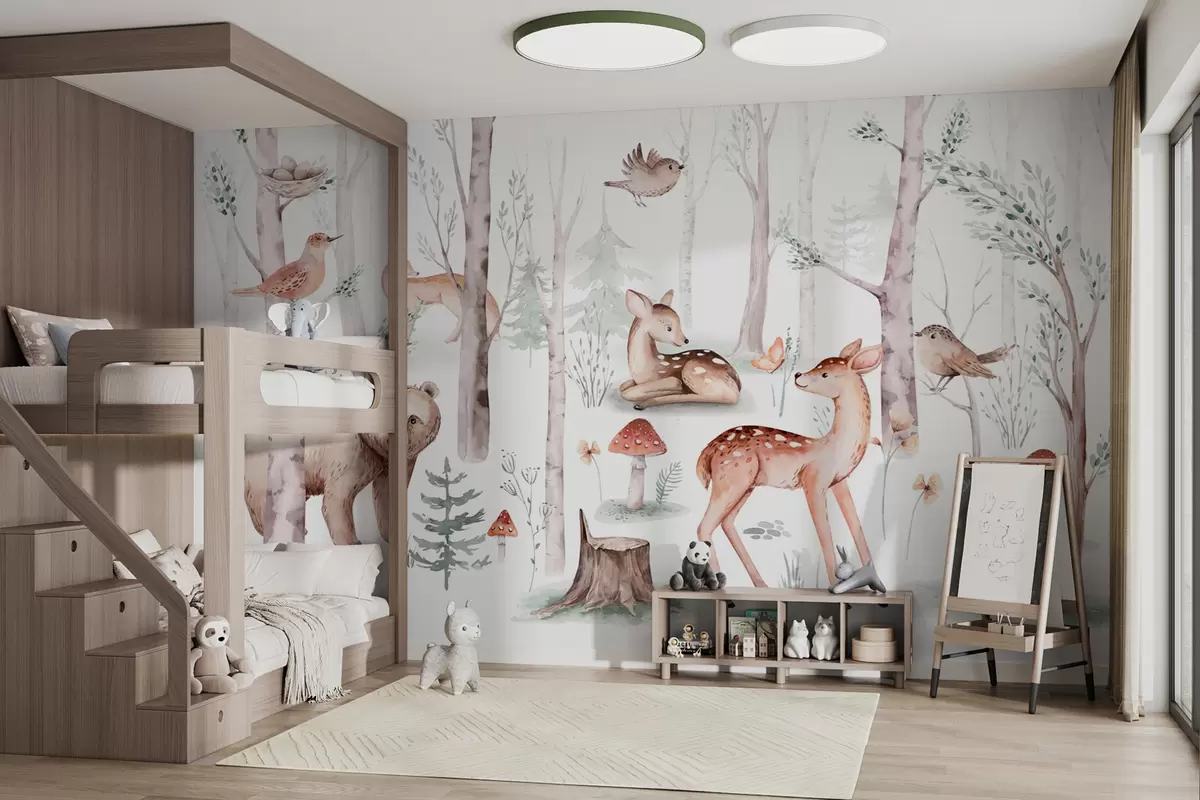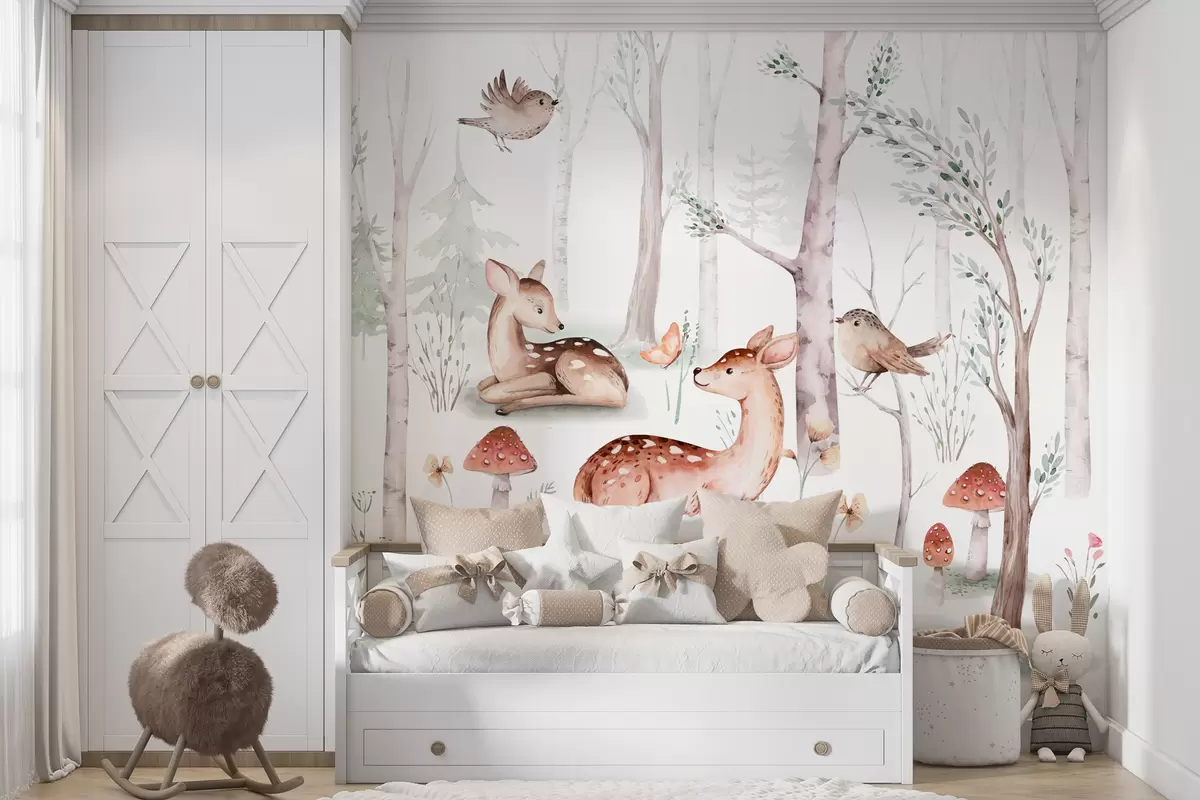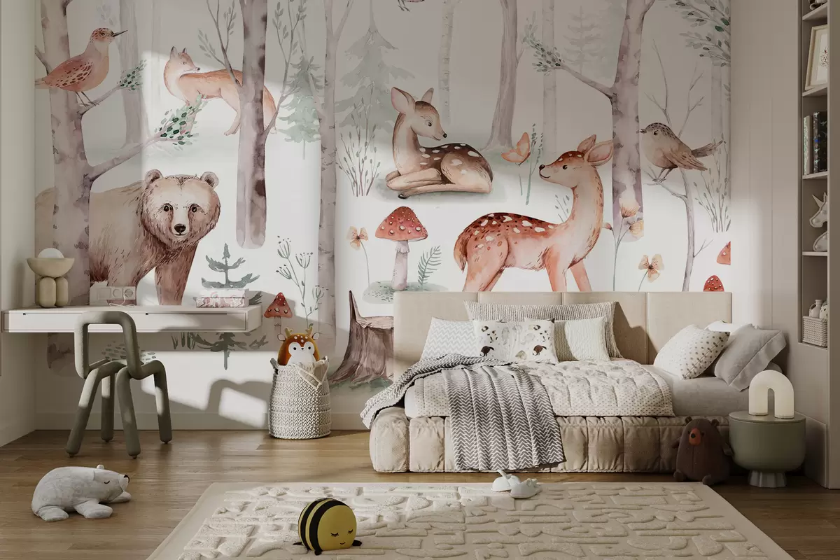 Фототапет Тапети за детската стая, горски животни. Деликатен тапет в акварелен стил в приятни топли пастелни цветове на бял фон Nr w01089