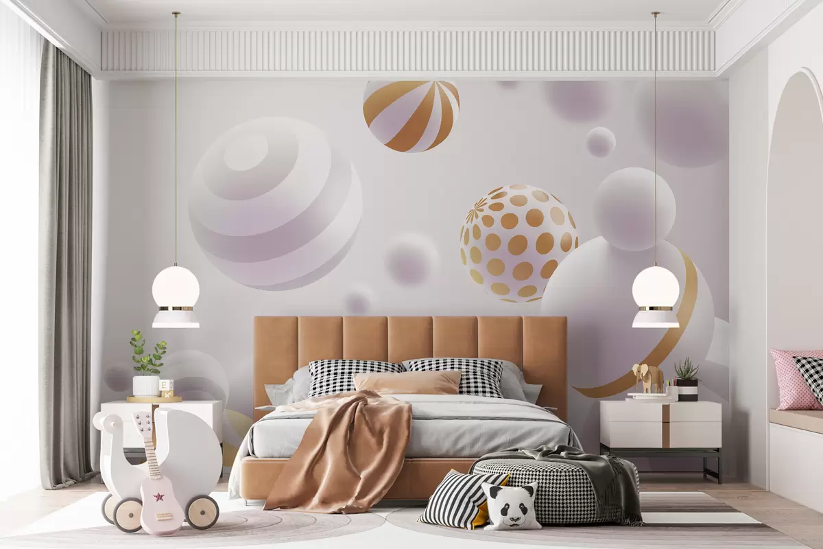 Фототапет Обемни летящи сфери в 3D стил в светлосиви тонове с оранжеви акценти Nr w01148