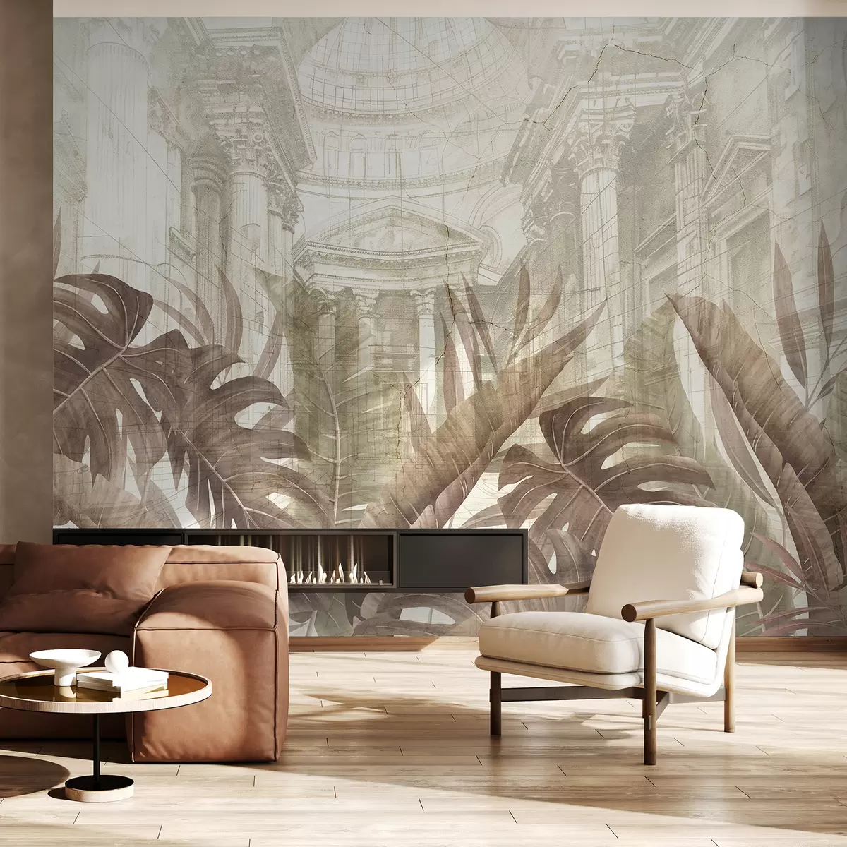 Фототапет Величествена рисунка с богато украсени архитектурни мраморни колони и буйни тропически растения сепия Nr w01311v1