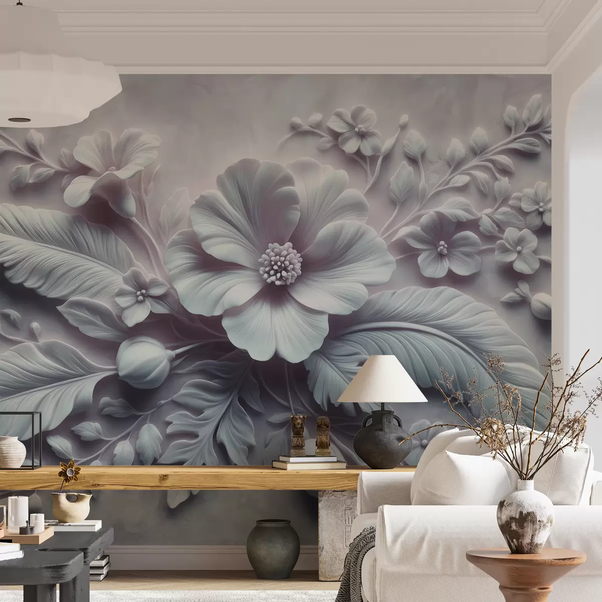 Фототапет 3D релефно изкуство за стена с пера и цветя, с голям мак в светлосини цветове Nr w01340v2